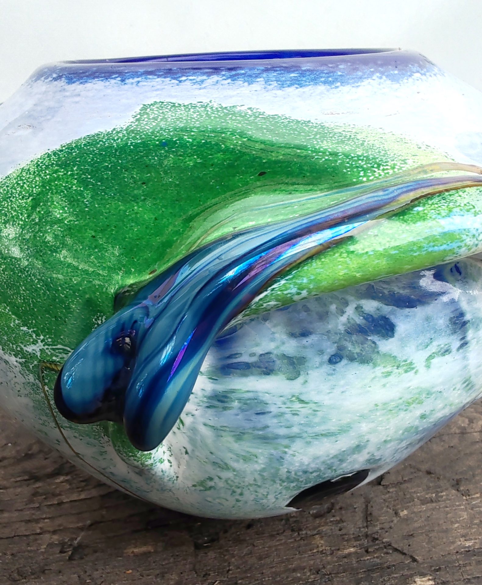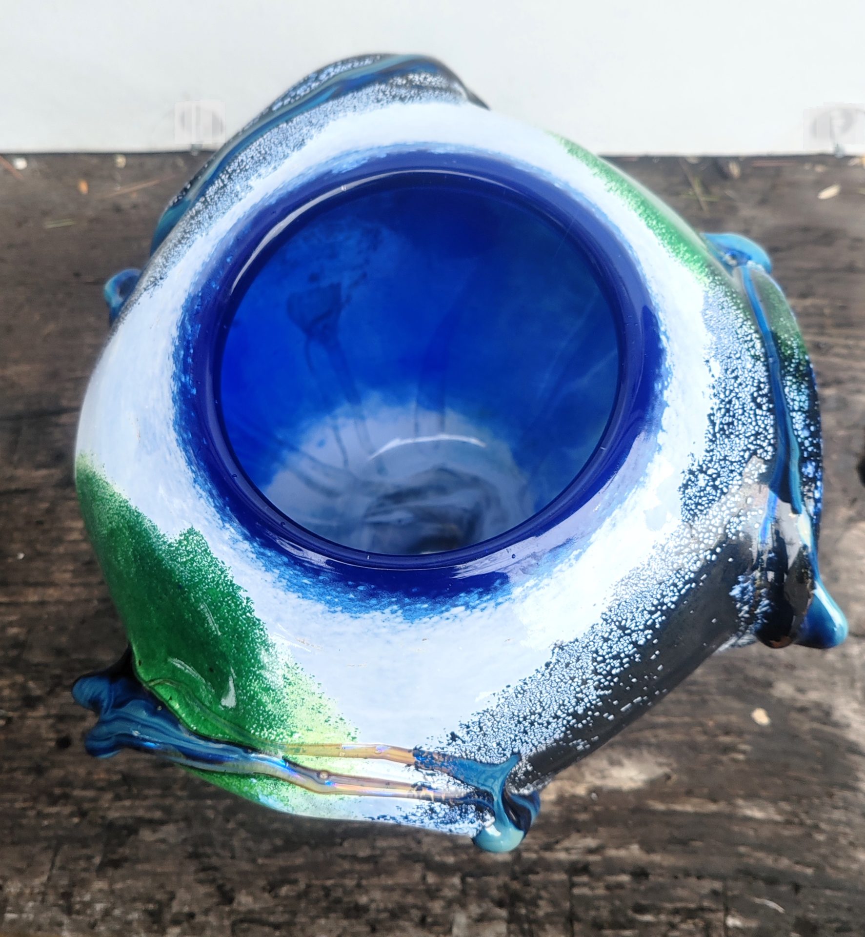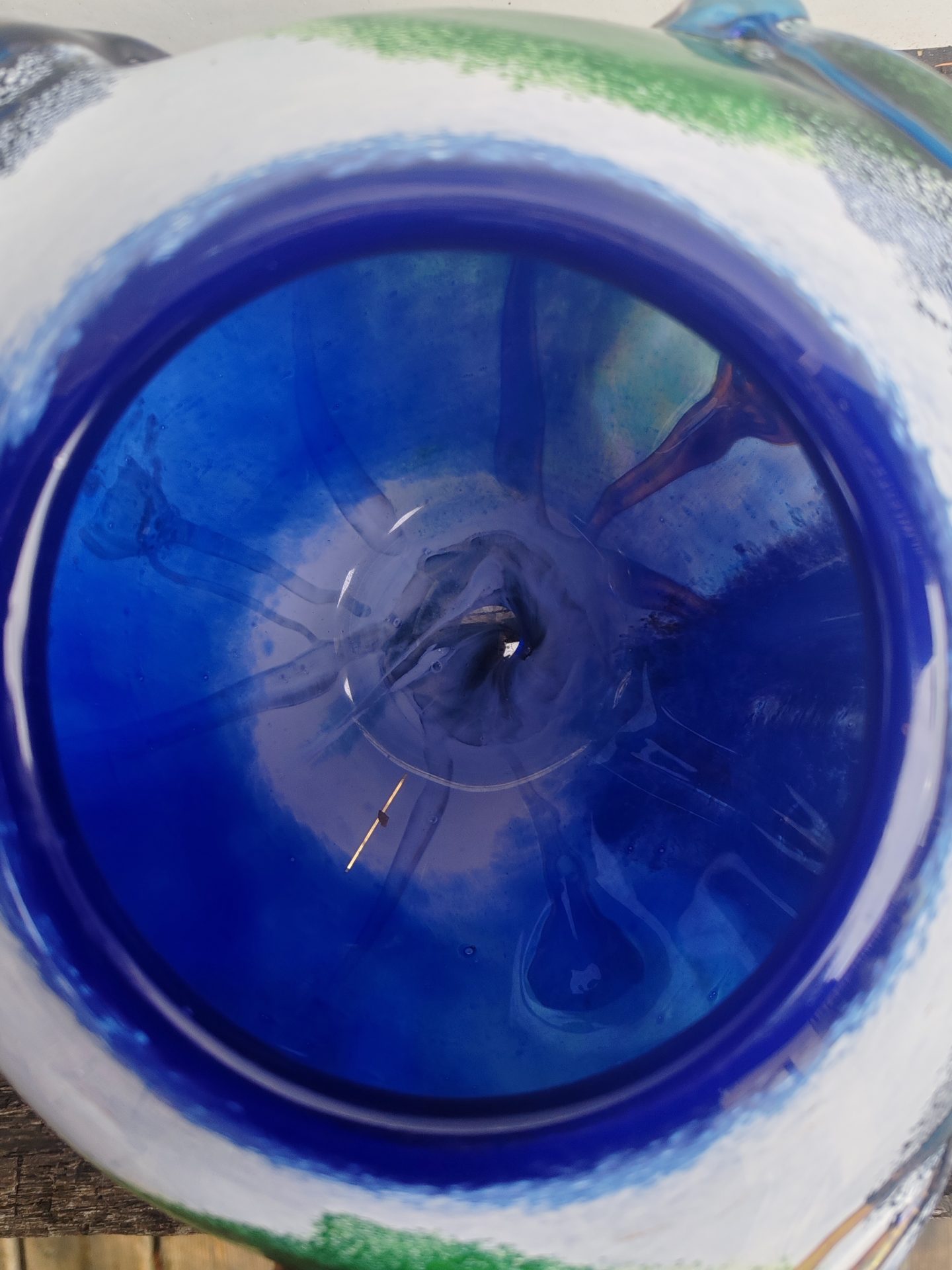 HomeBoutiqueUncategorizedAlda Loumani Grand vase en verre soufflé multicouche à coulures vertes bleues et blanches 1988