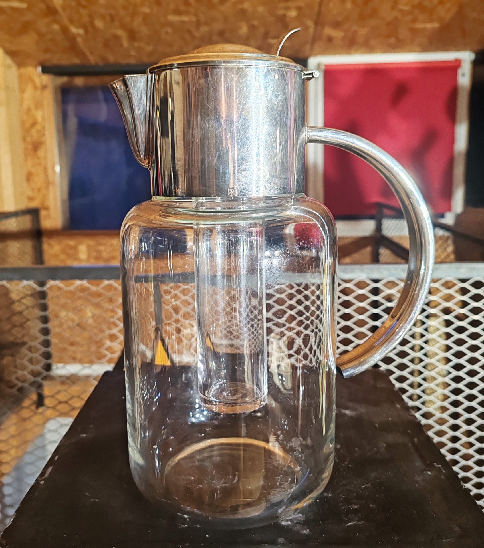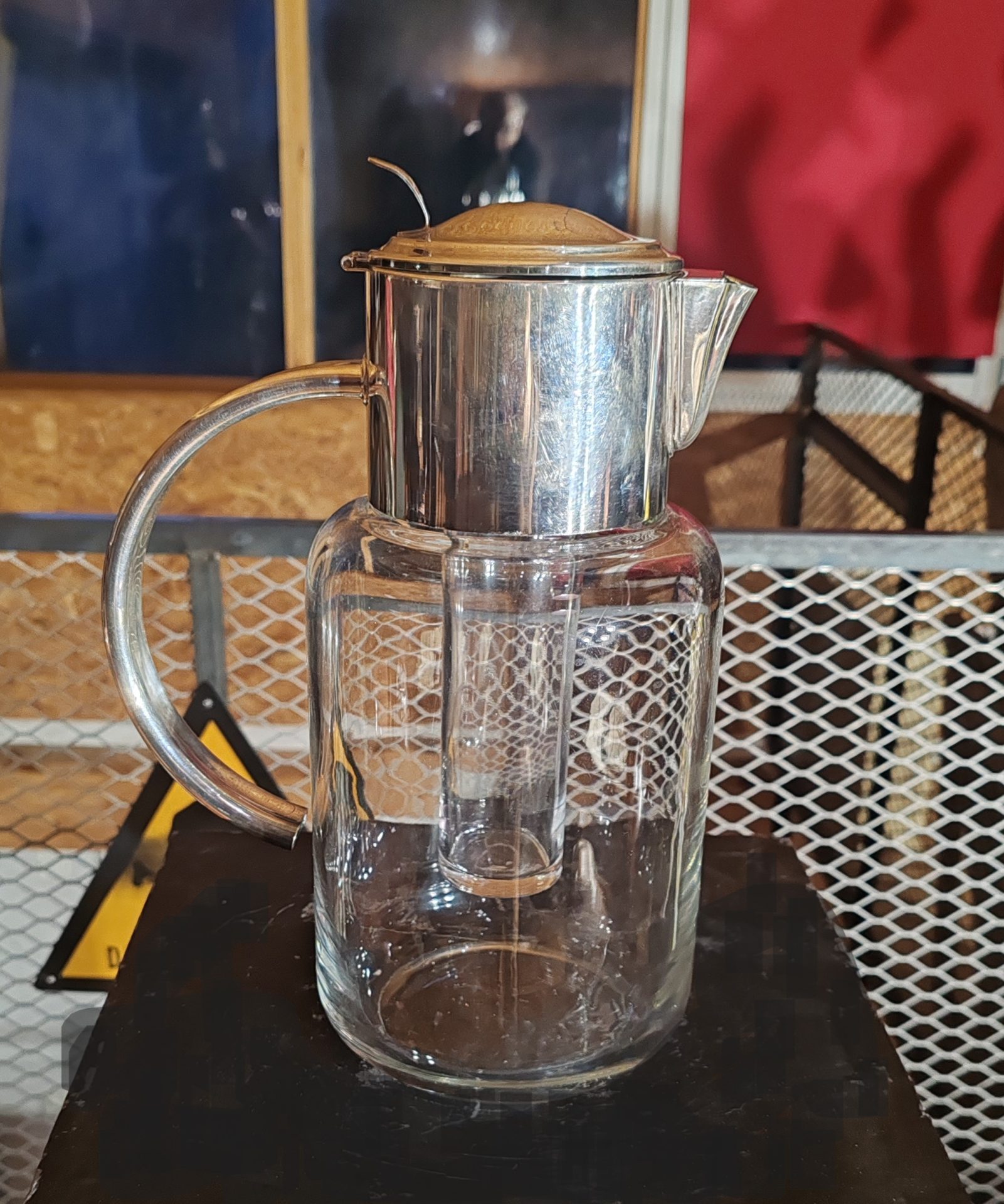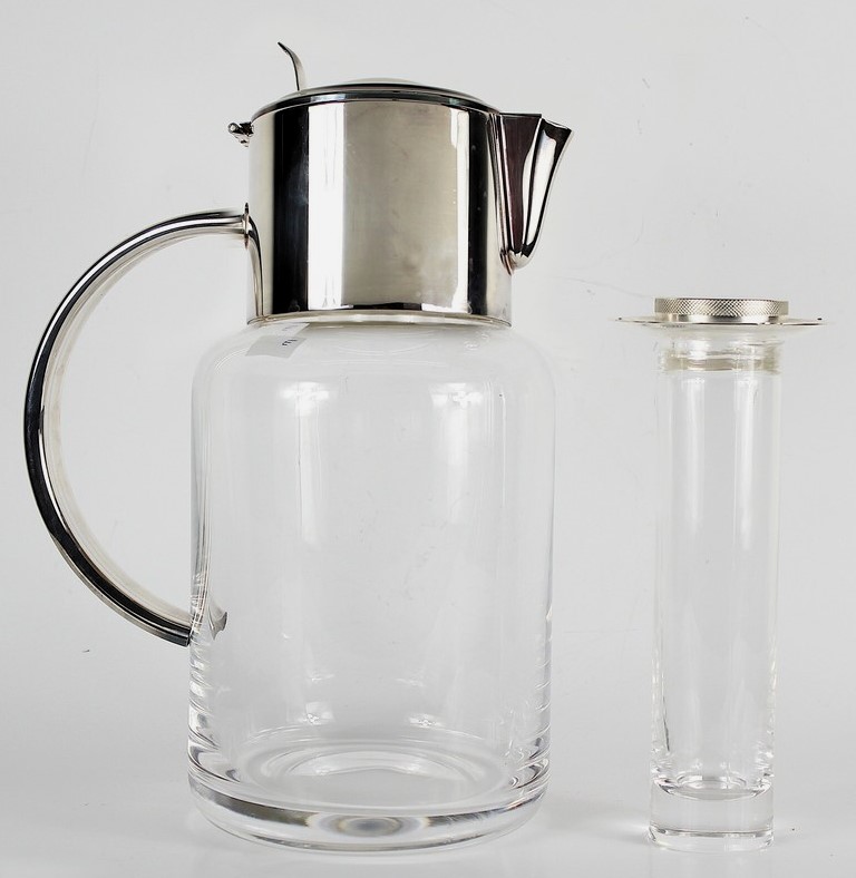 Carafe à vin, orangeade, sangria,… en verre, raffiné des années 1970, avec son seau à glace intégré, muni d’une anse et d’un col argentés.