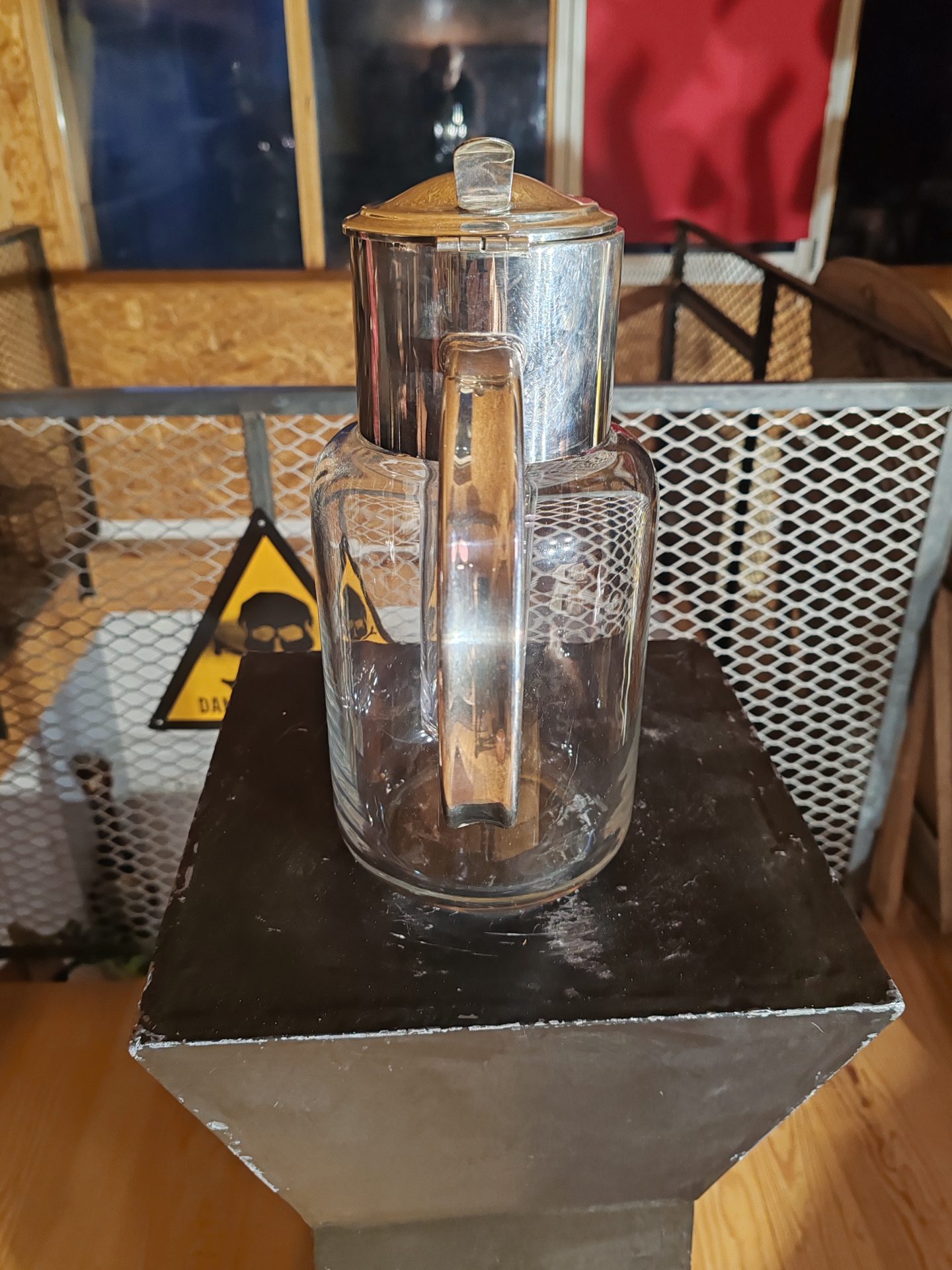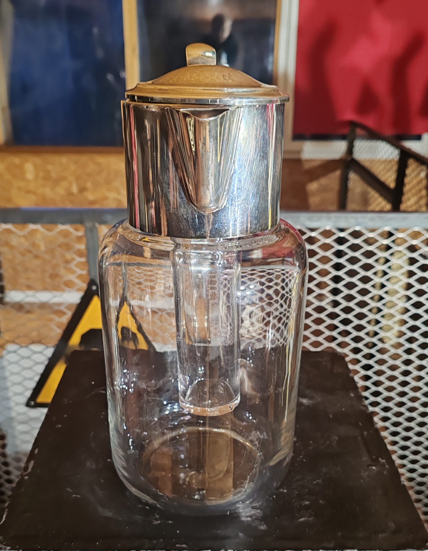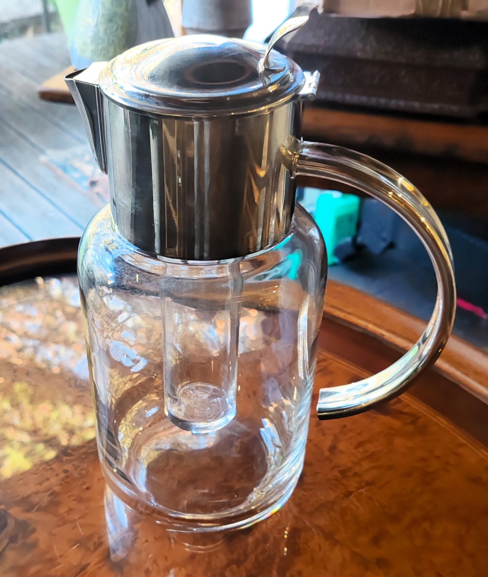 Carafe à vin, orangeade, sangria,… en verre, raffiné des années 1970, avec son seau à glace intégré, muni d’une anse et d’un col argentés.