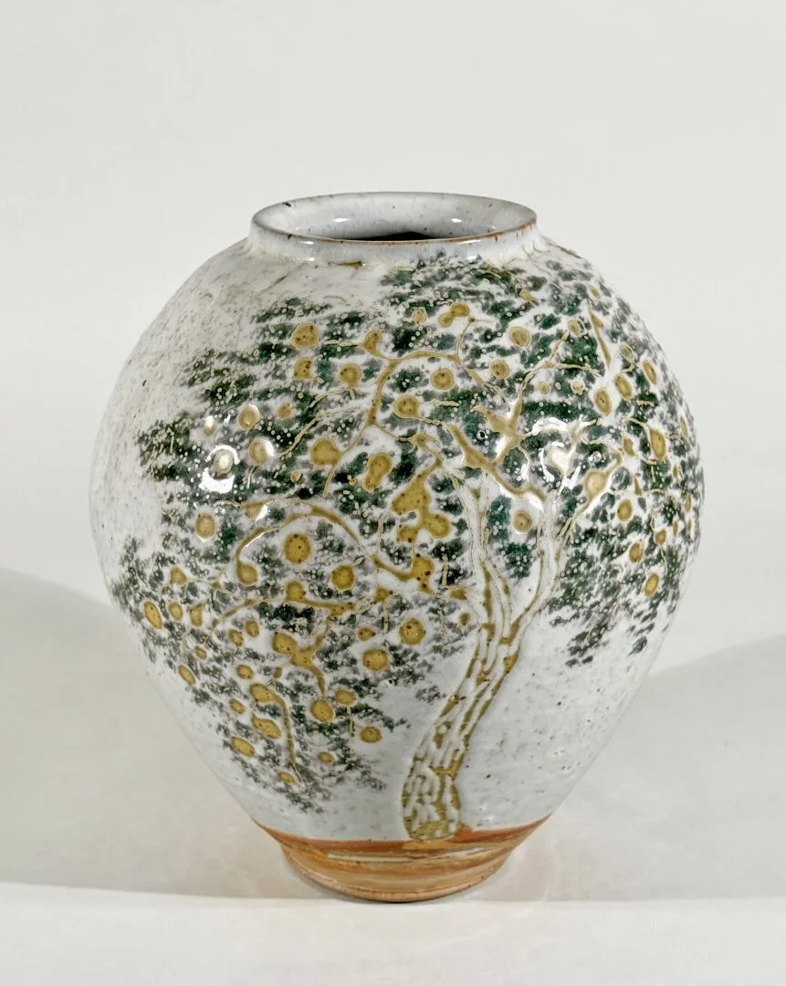 Grand VASE ovoïde en céramique émaillée à décor d’arbre en fruit sur fond crème. (Shino clair)