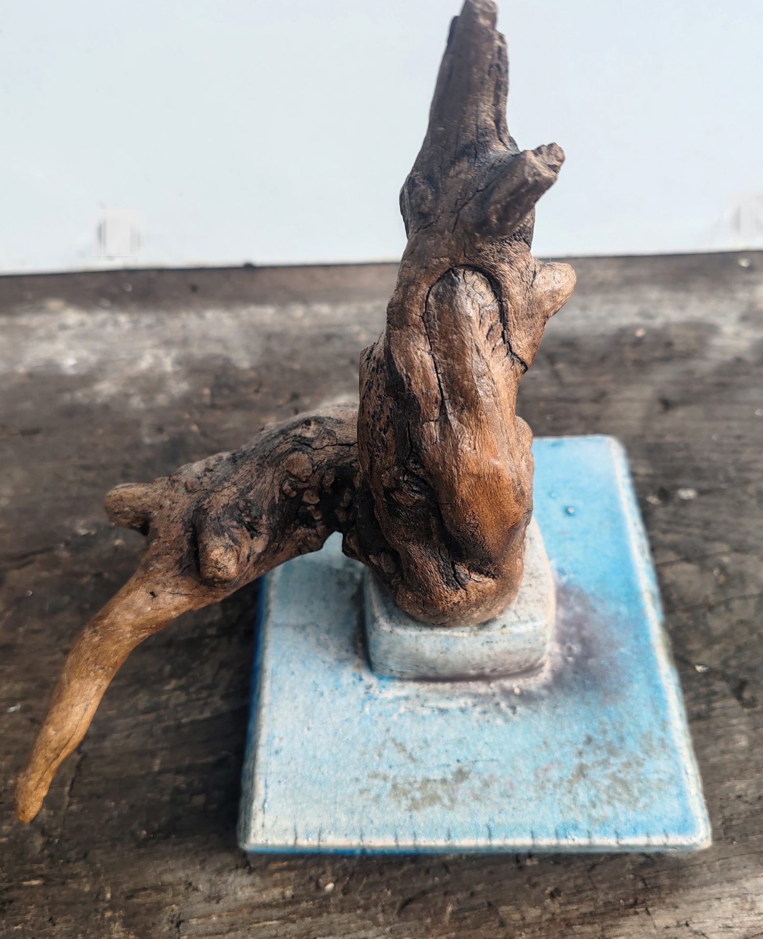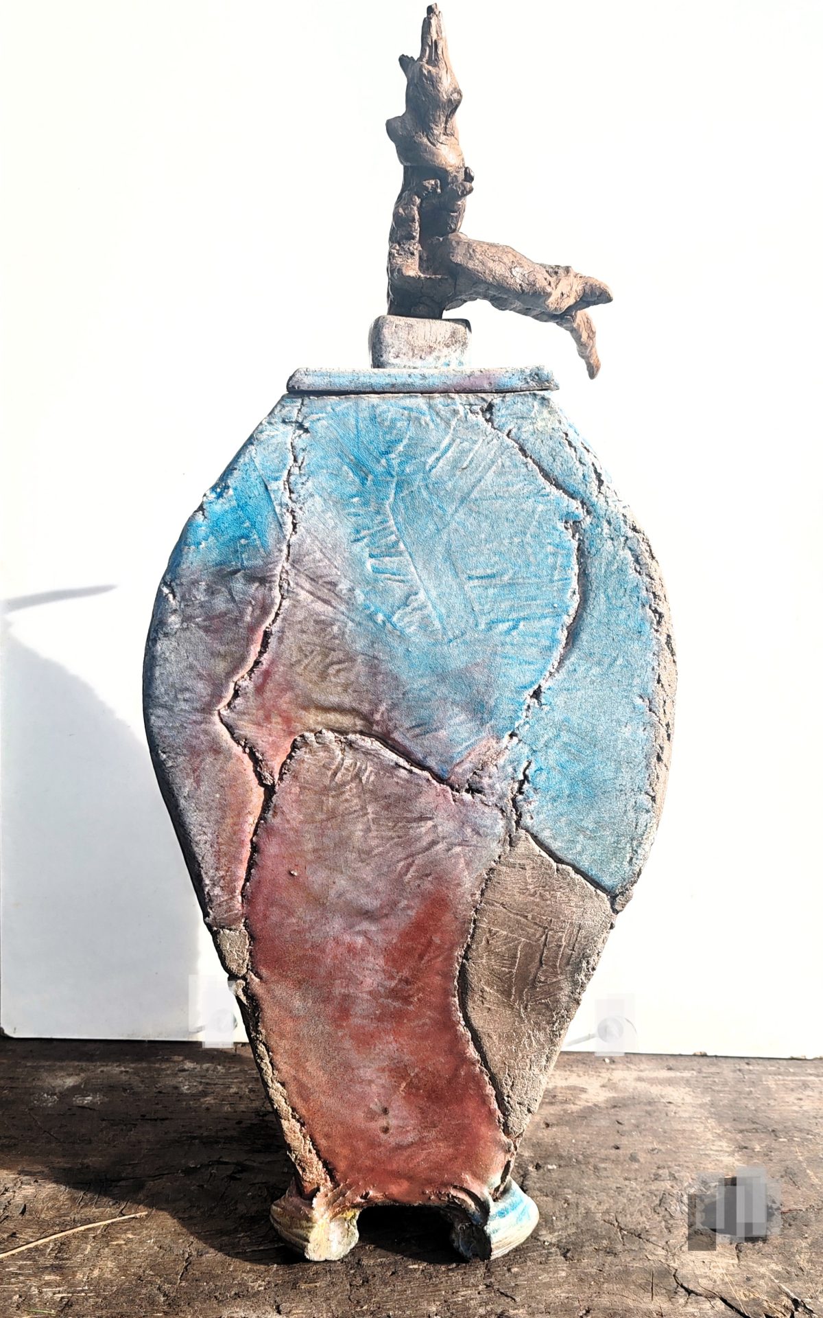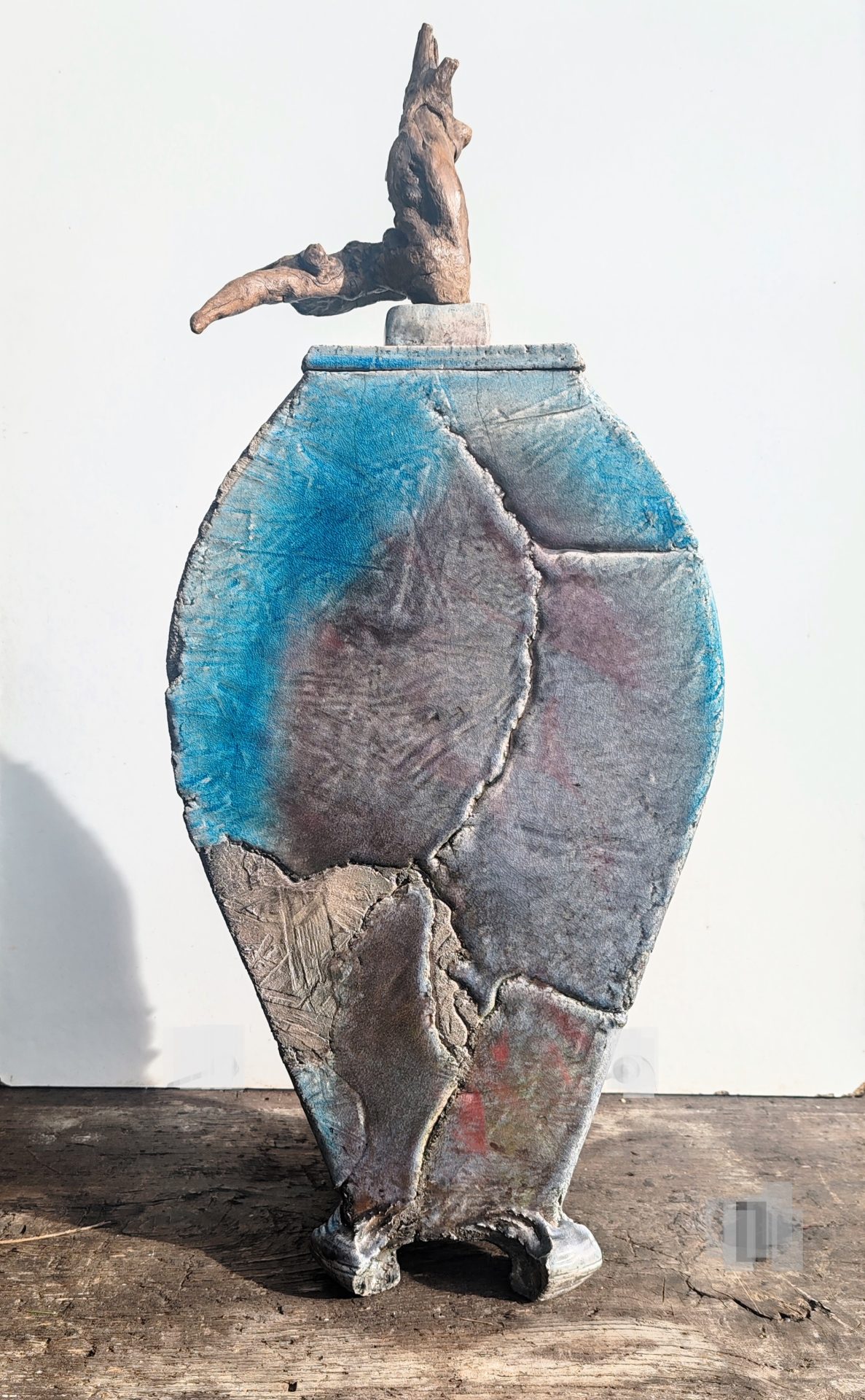 Superbe et atypique, grand pot couvert en grès émaillé  RAKU, aux couleurs polychromes,  la prise du couvercle prise en bois flotté ou racine, intégré comme prolongement , repose sur quatre petits pieds travaillés.