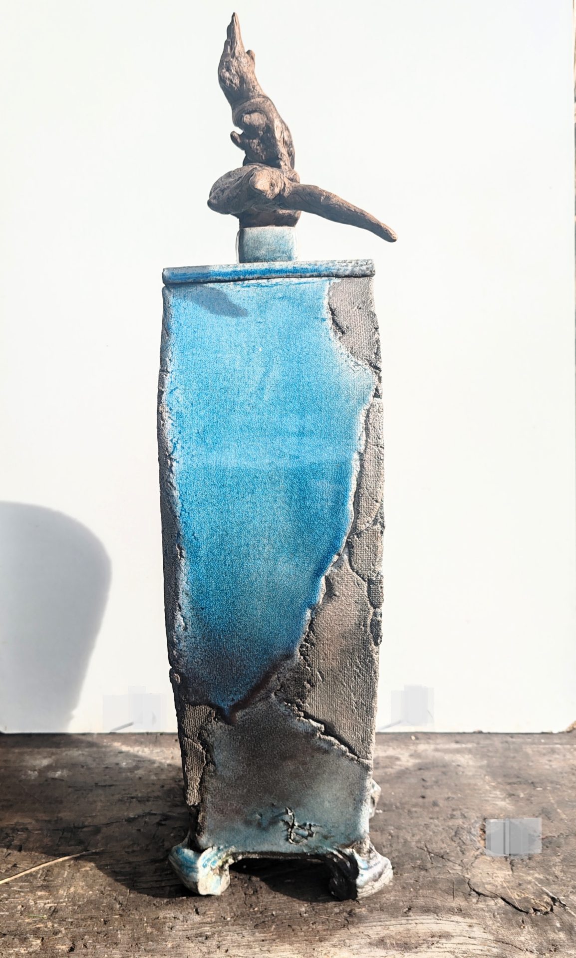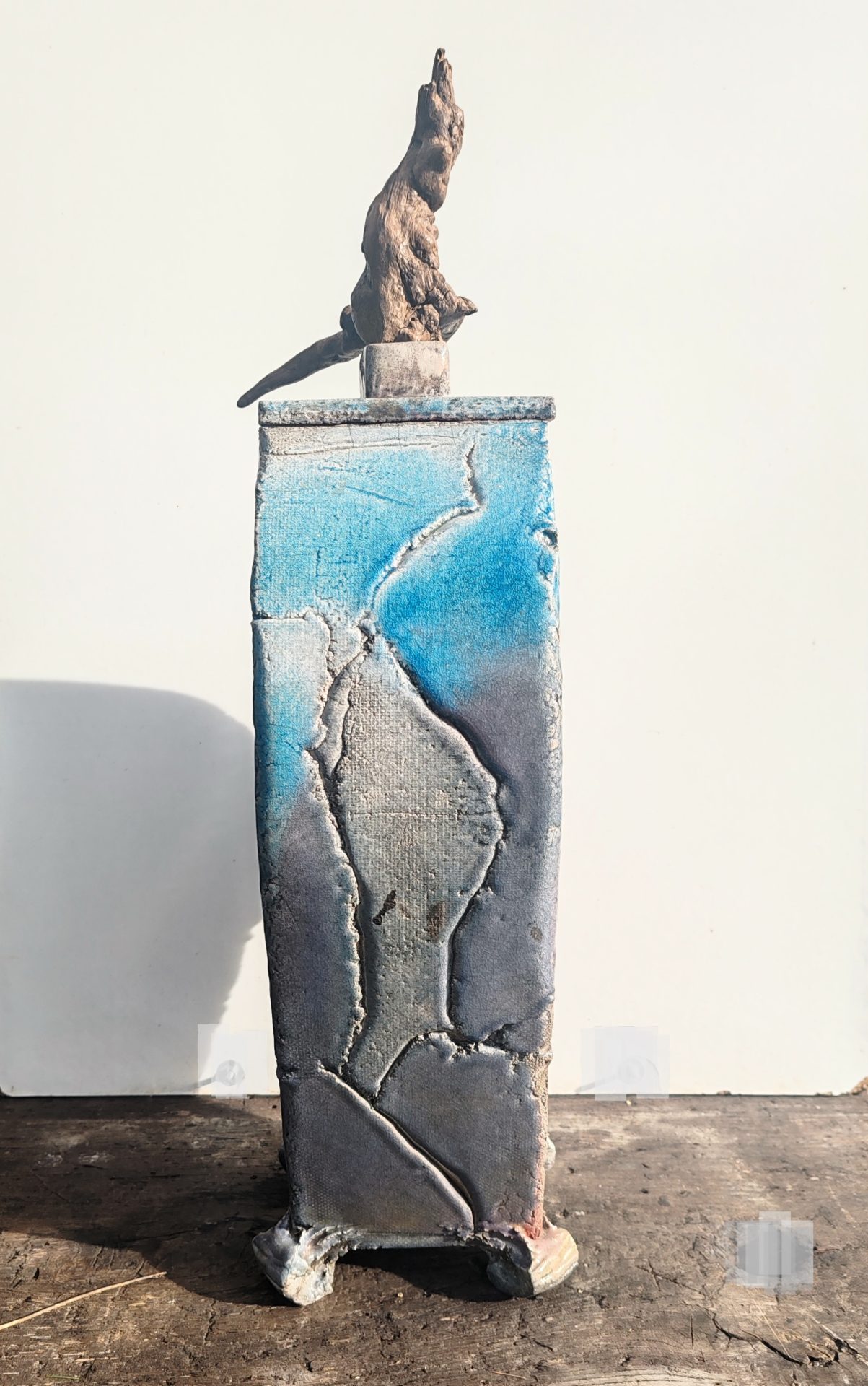 Scuptural, presque anthropomorphe, imposant et trés décoratif, bel effet de matière, esprit brutaliste, Couleurs sourdes (gris, bleus, ocres)