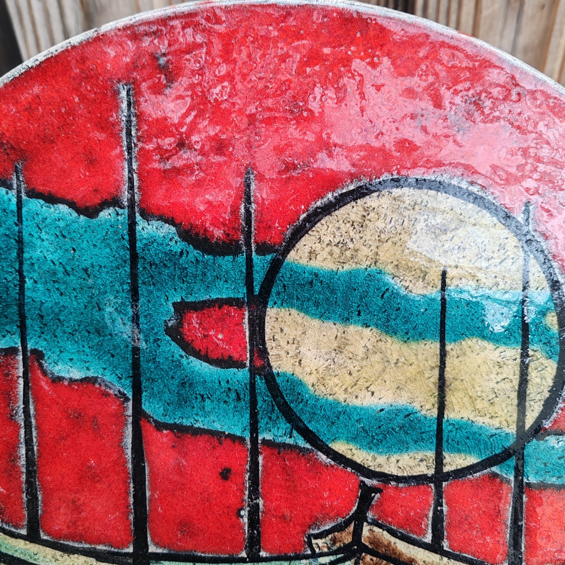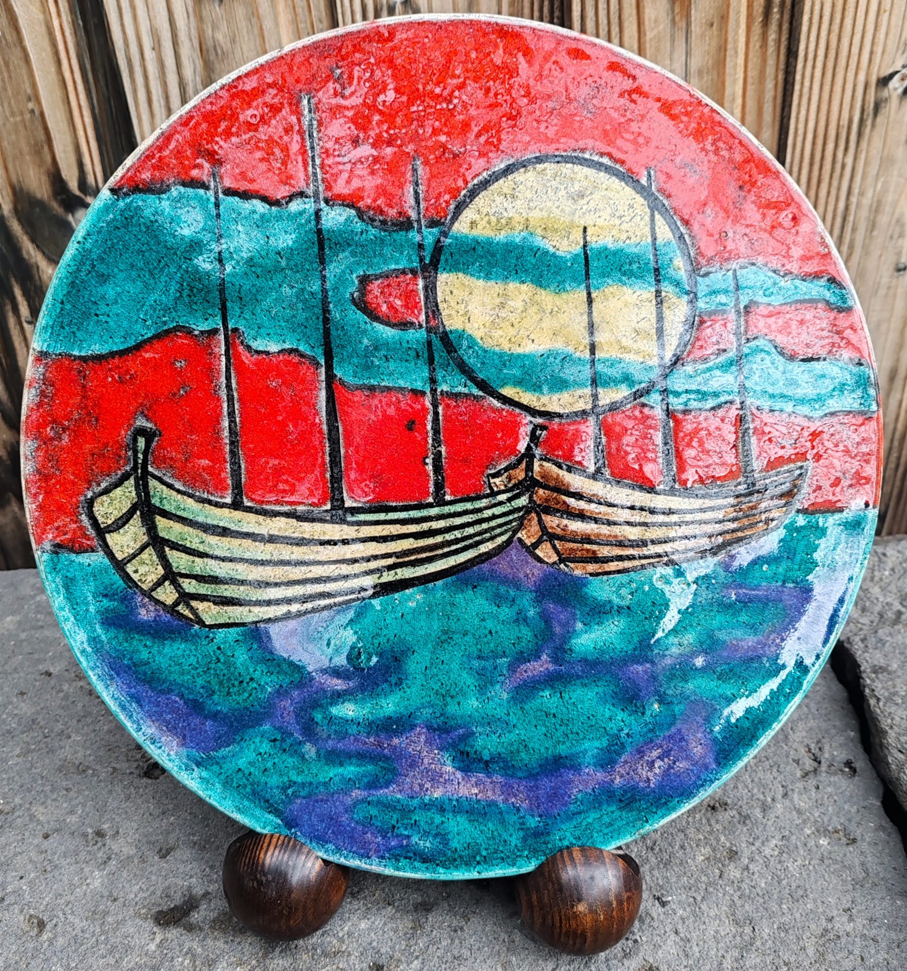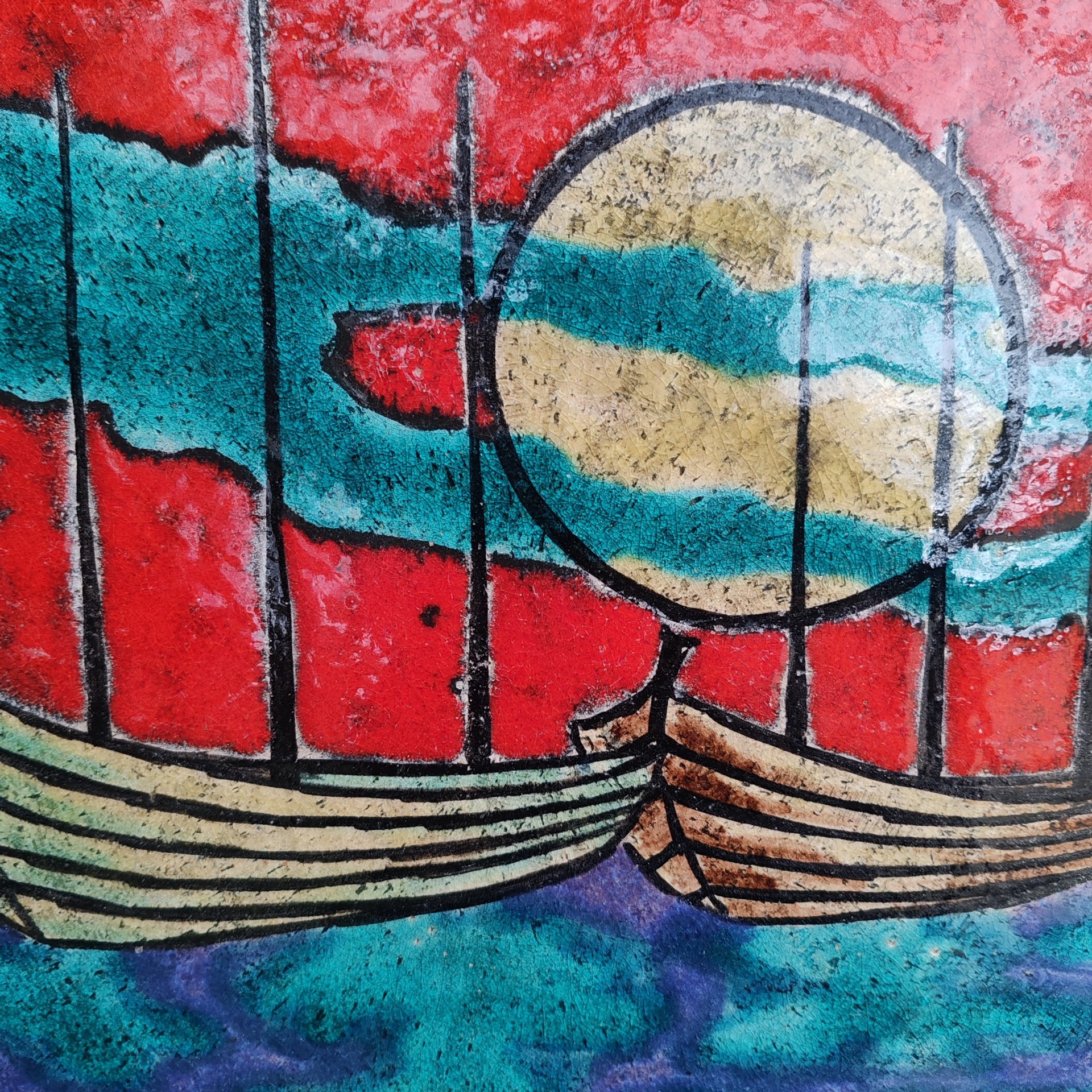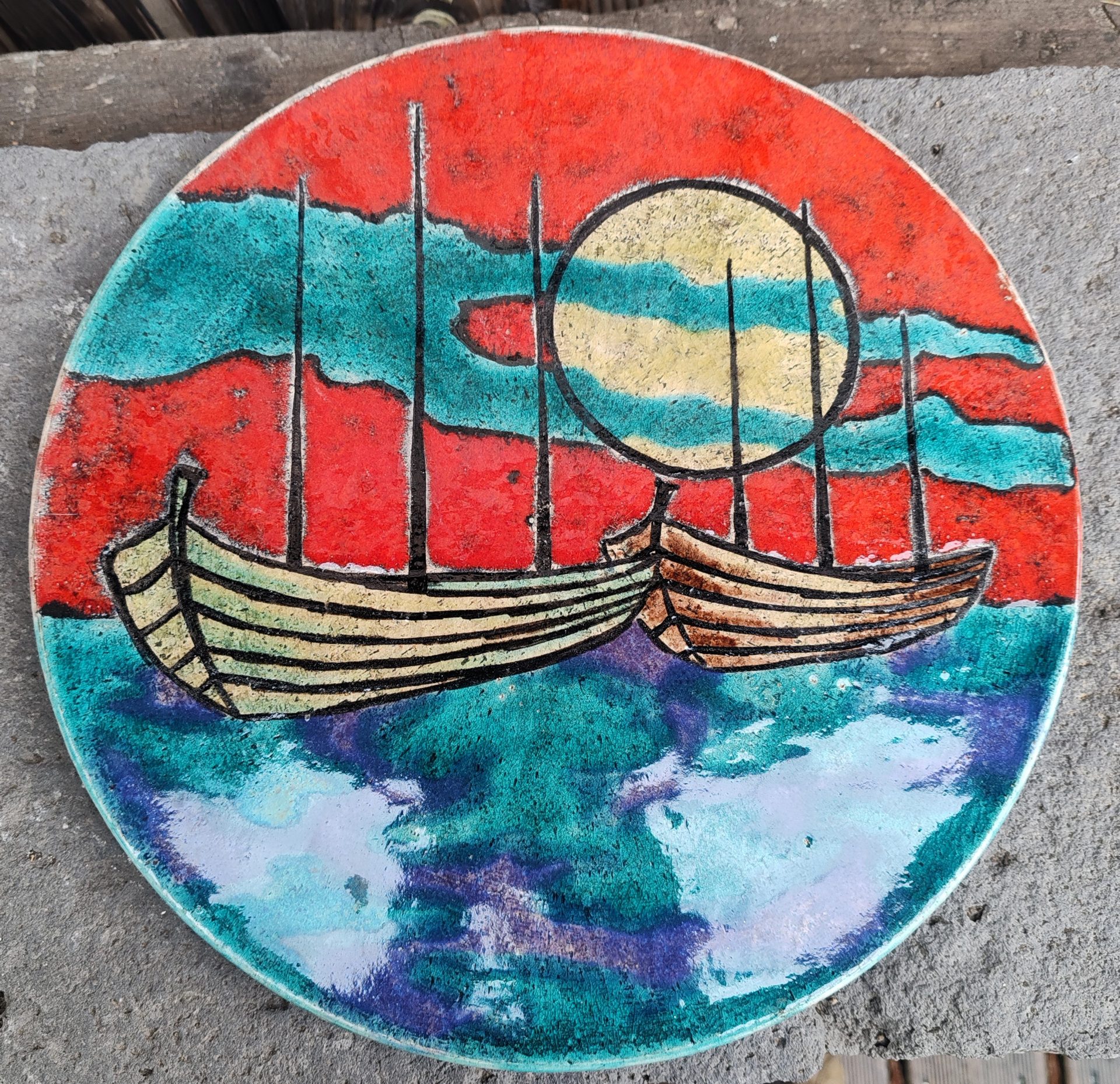 Très grande assiette en céramique émaillée d’ Hugo Kohler, de Bienne, (Suisse) ornée de bateaux, soleil et mer, vers 1960.