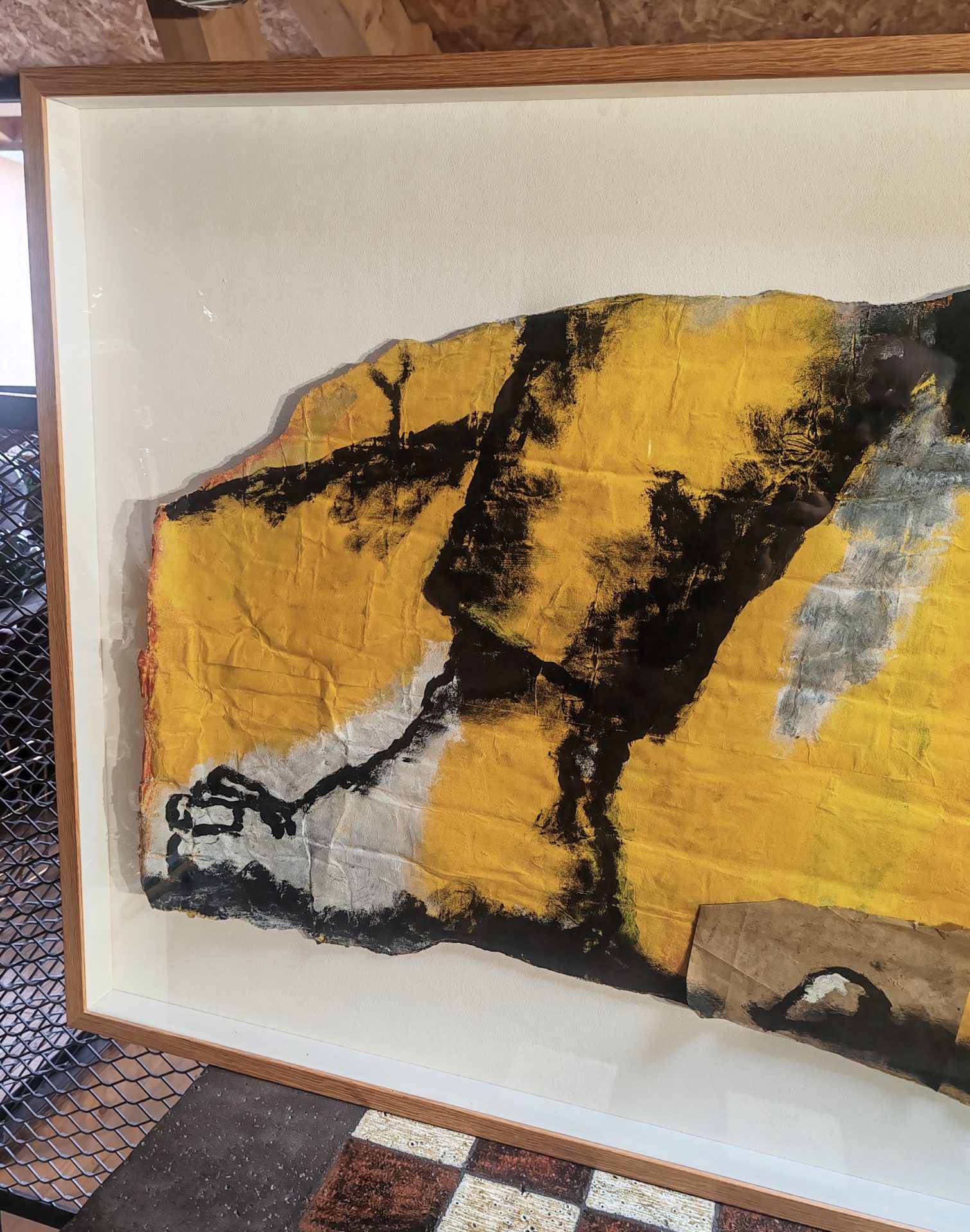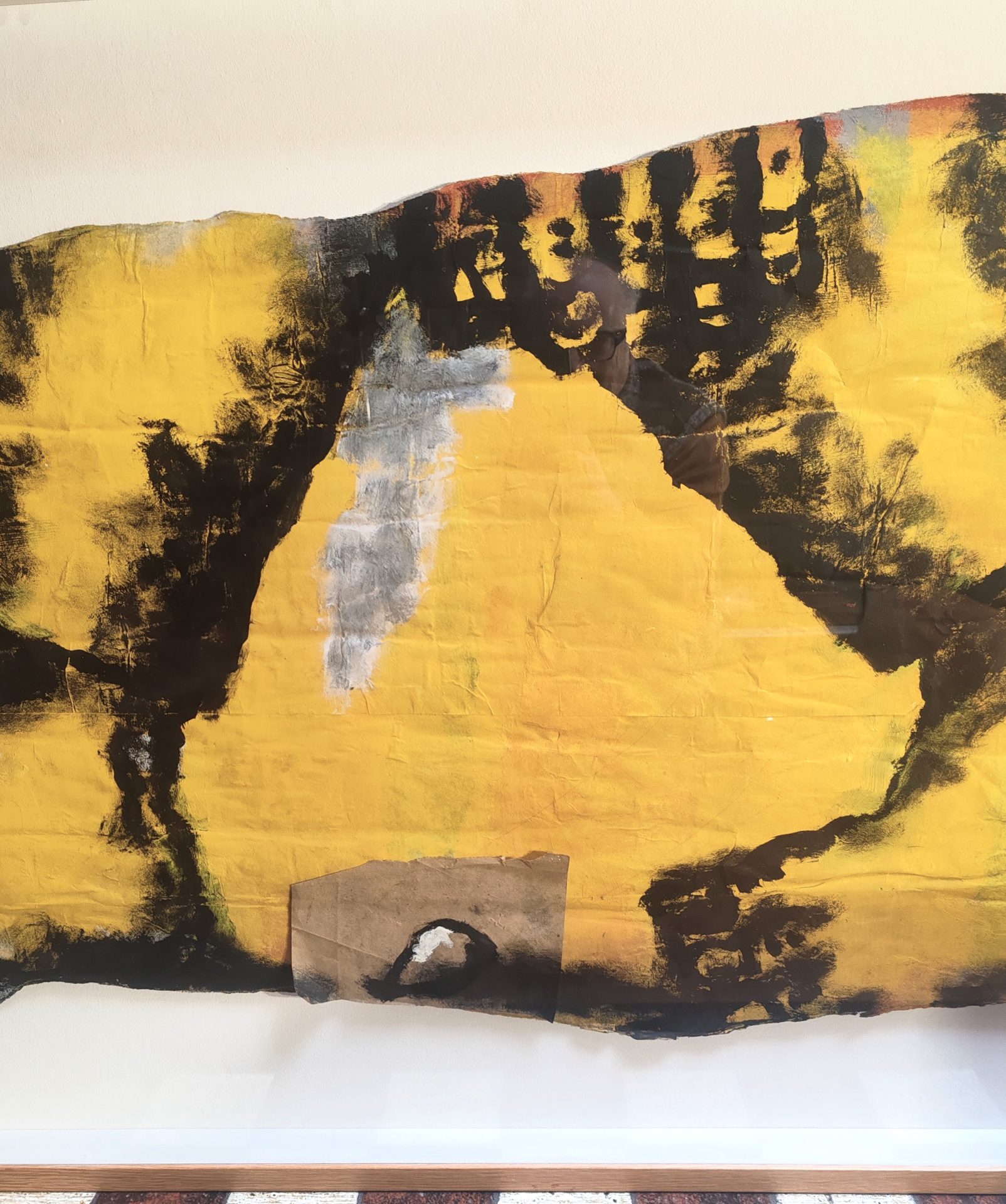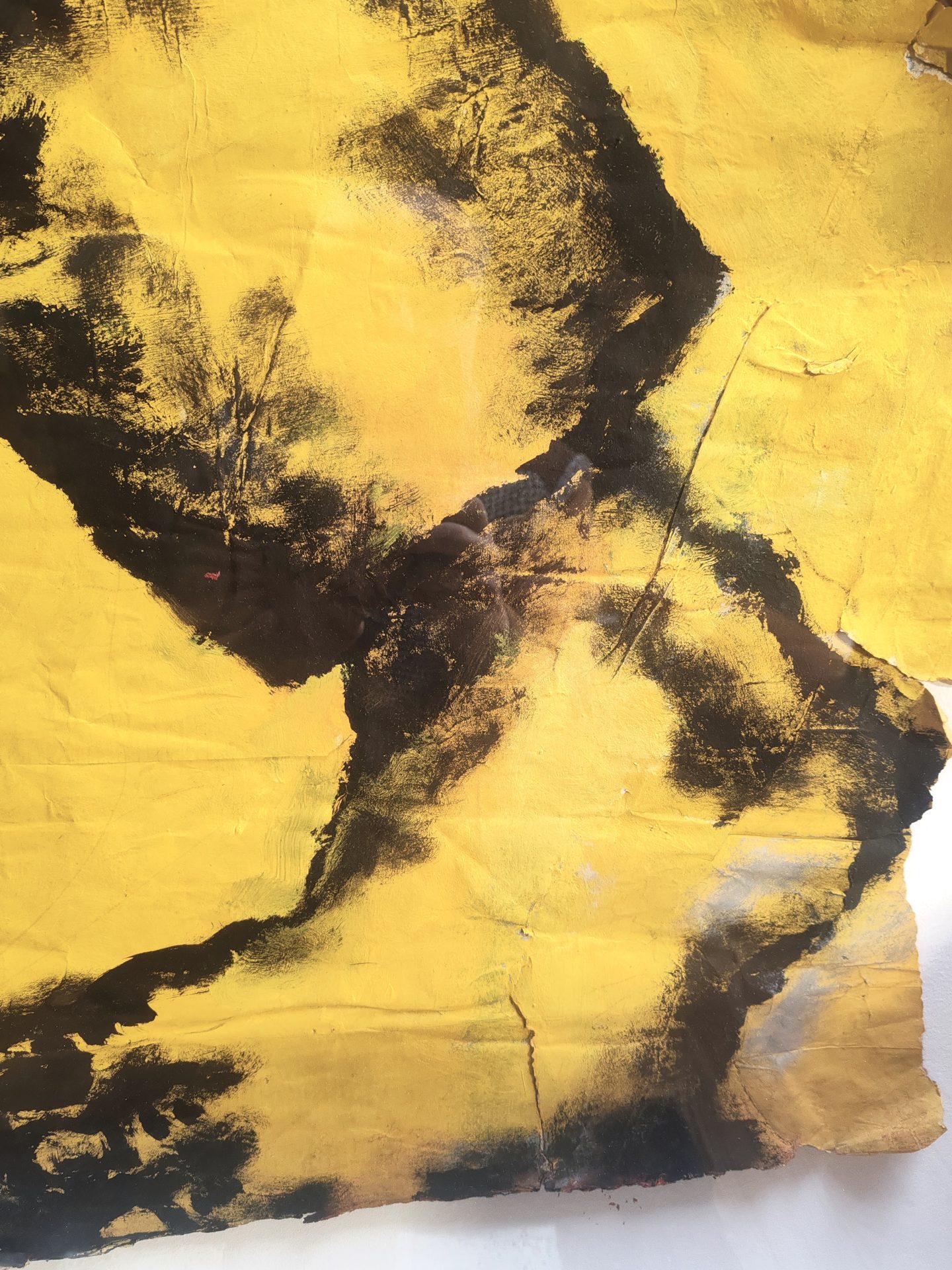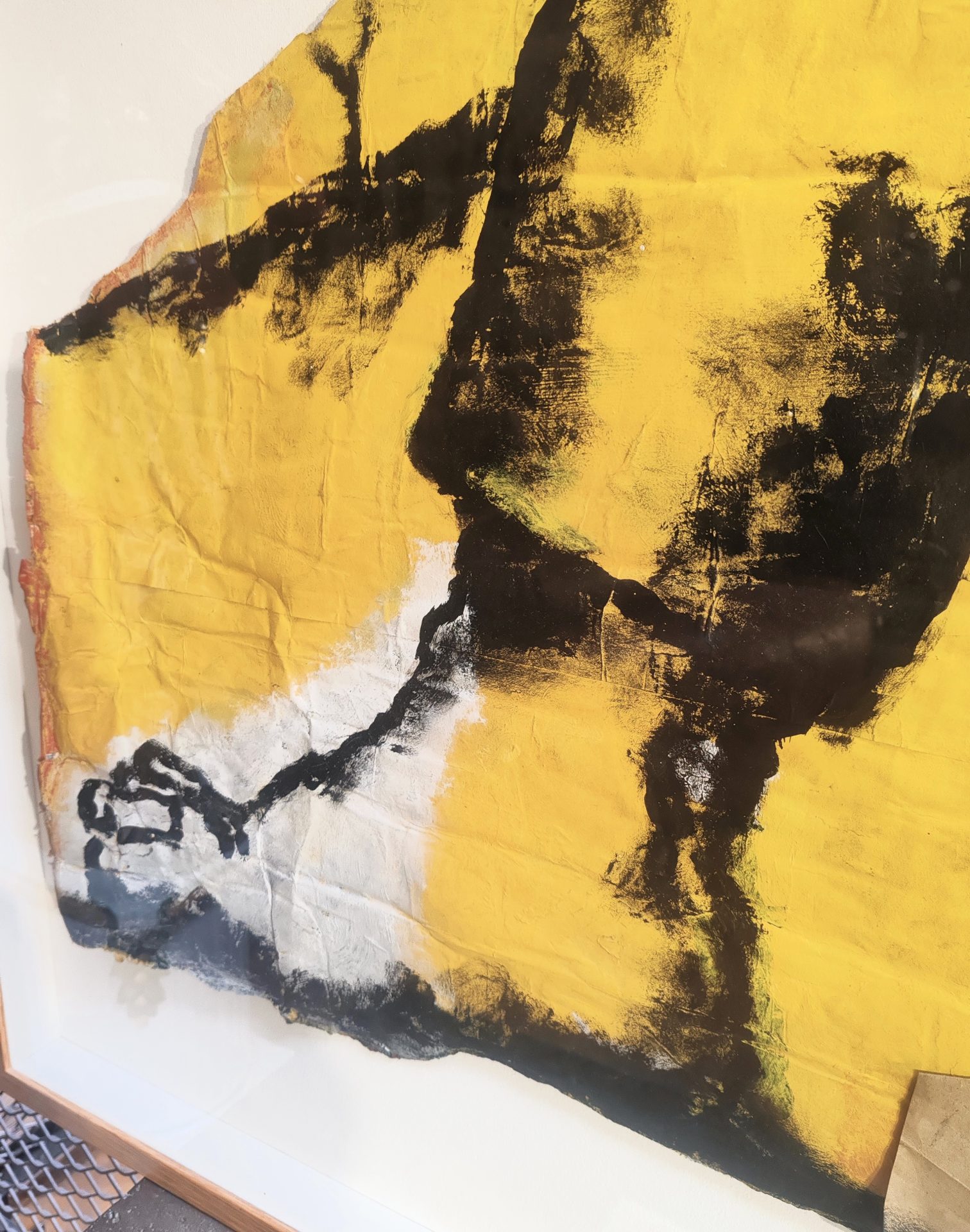 Deux pieds marchent d’un pas ample sur le sable jaune. Coupés juste au-dessus des chevilles, ils appartiennent vraisemblablement à une figure gigantesque. Ici aussi, le fragment d’affiche détermine le format, en l’occurrence un large format horizontal où seuls les pieds du géant trouvent leur place. La structure et la rugosité des bandes d’affiche correspondent au sol suggéré par la zone jaune. Les bouts de doigts coupés, qui font encore saillie dans l’image appartiennent manifestement à des bras allongés, sont également grotesques. Ici encore, le spectateur se trouve plongé dans un récit féerique, avec les caractéristiques très typiques de l’univers visuel et conceptuel de Blais