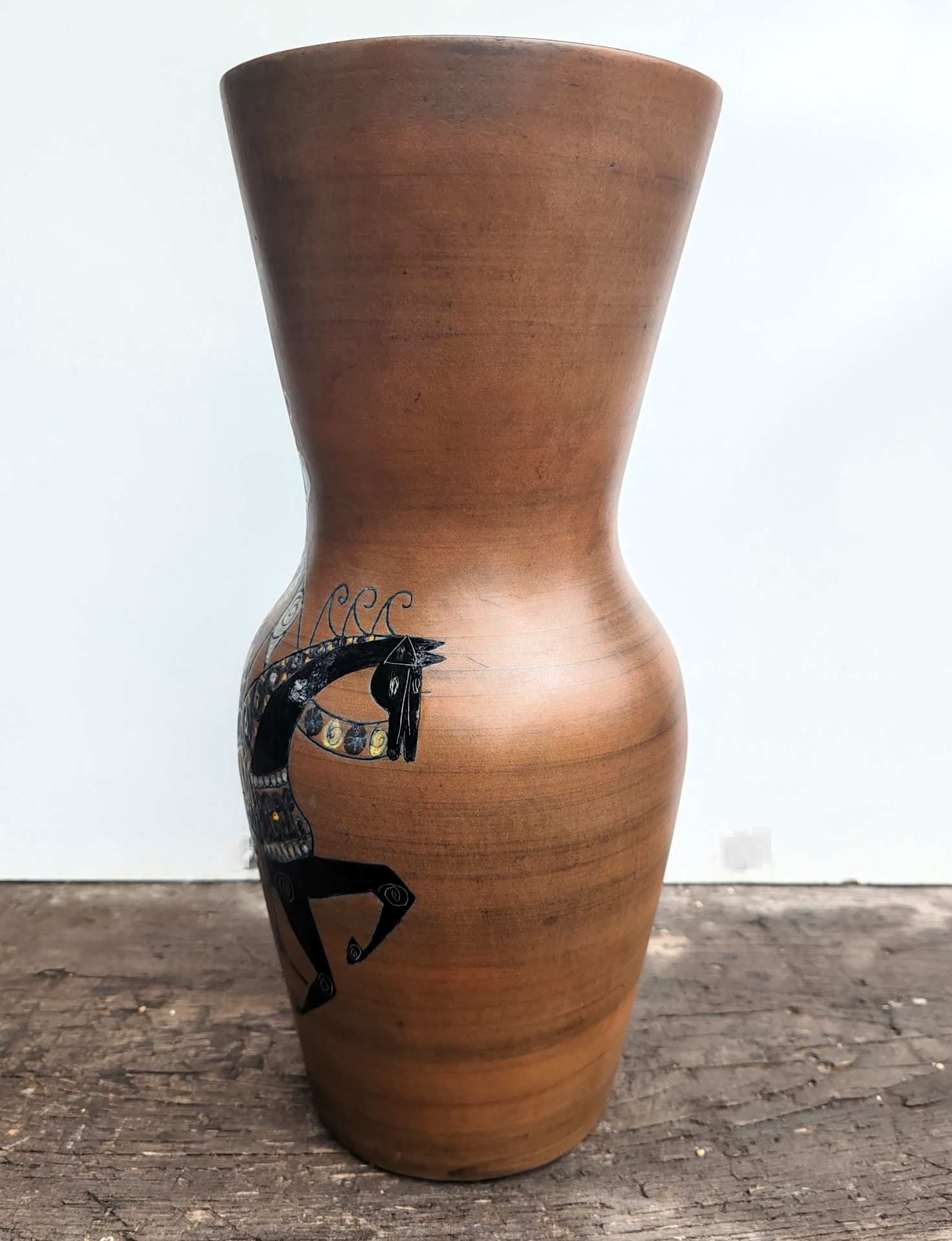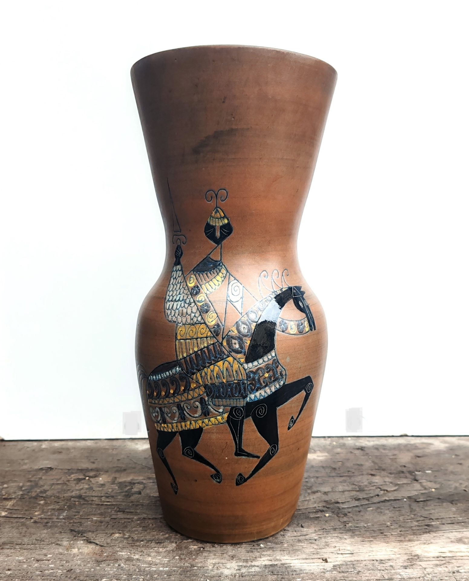 A great ceramic vase by Jean De Lespinasse with a brown, black and polychromatic enamelled cover and a decor of a horseman.