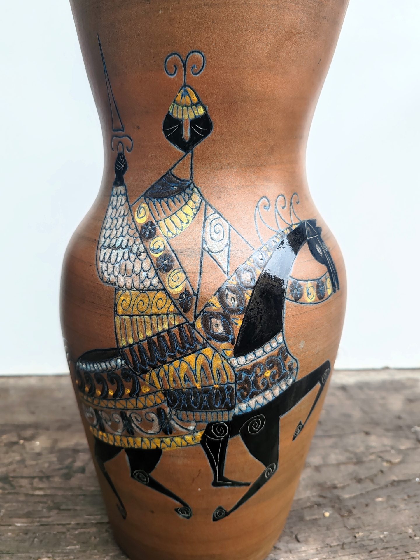 Magnifique grand vase par Jean de Lespinasse à décor d’un cavalier en armures et de chevaux caparaçonnés, de forme balustre en céramique à couverte marron nuancé noir et en partie polychrome.