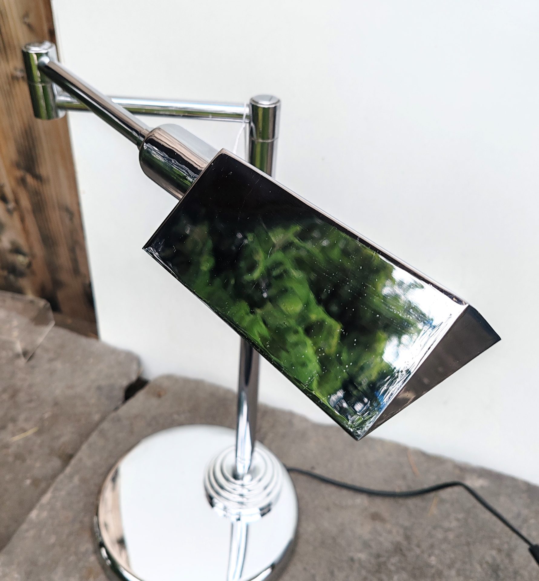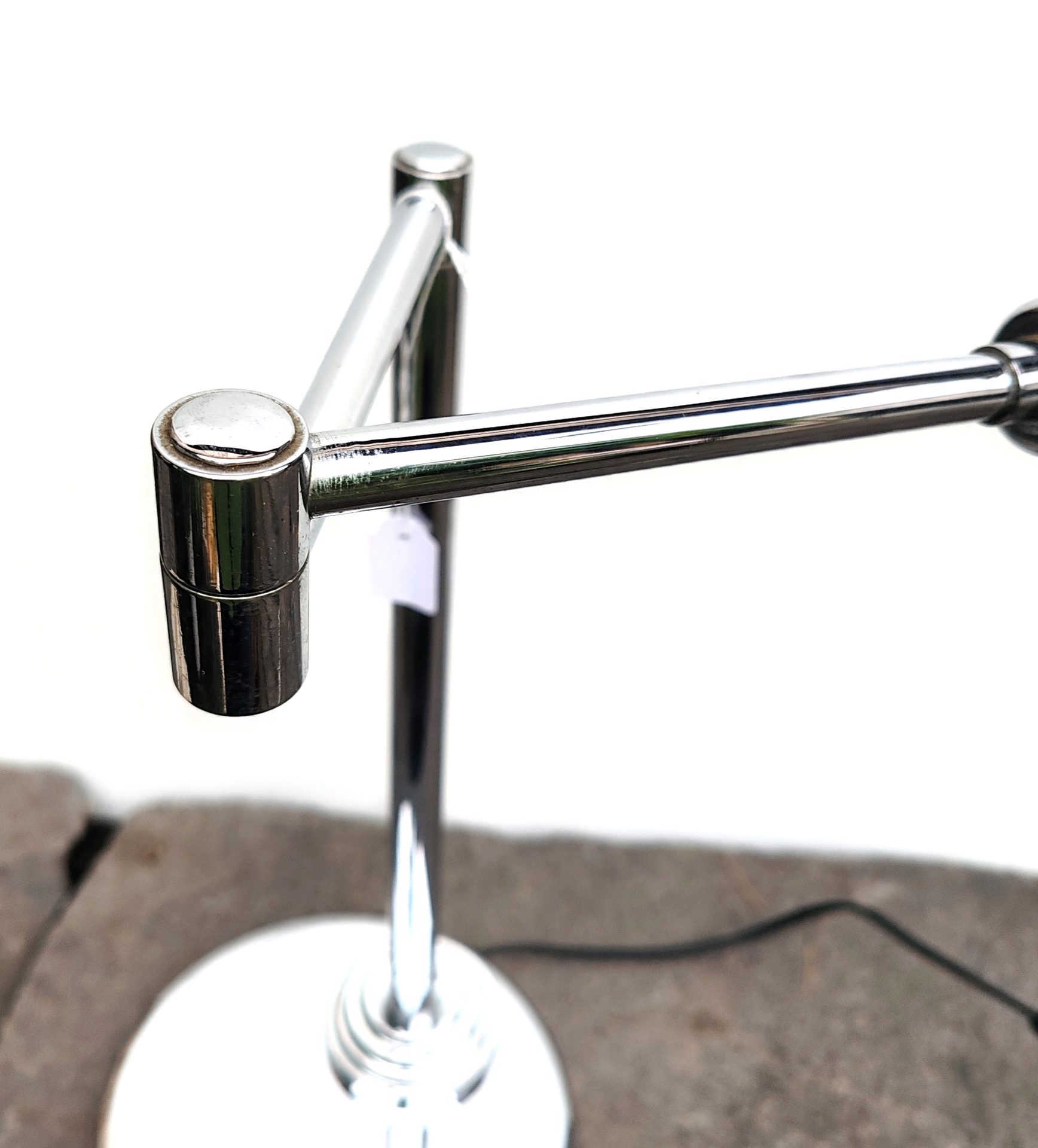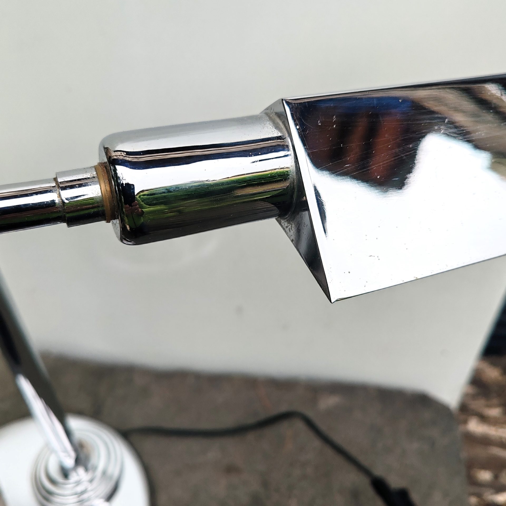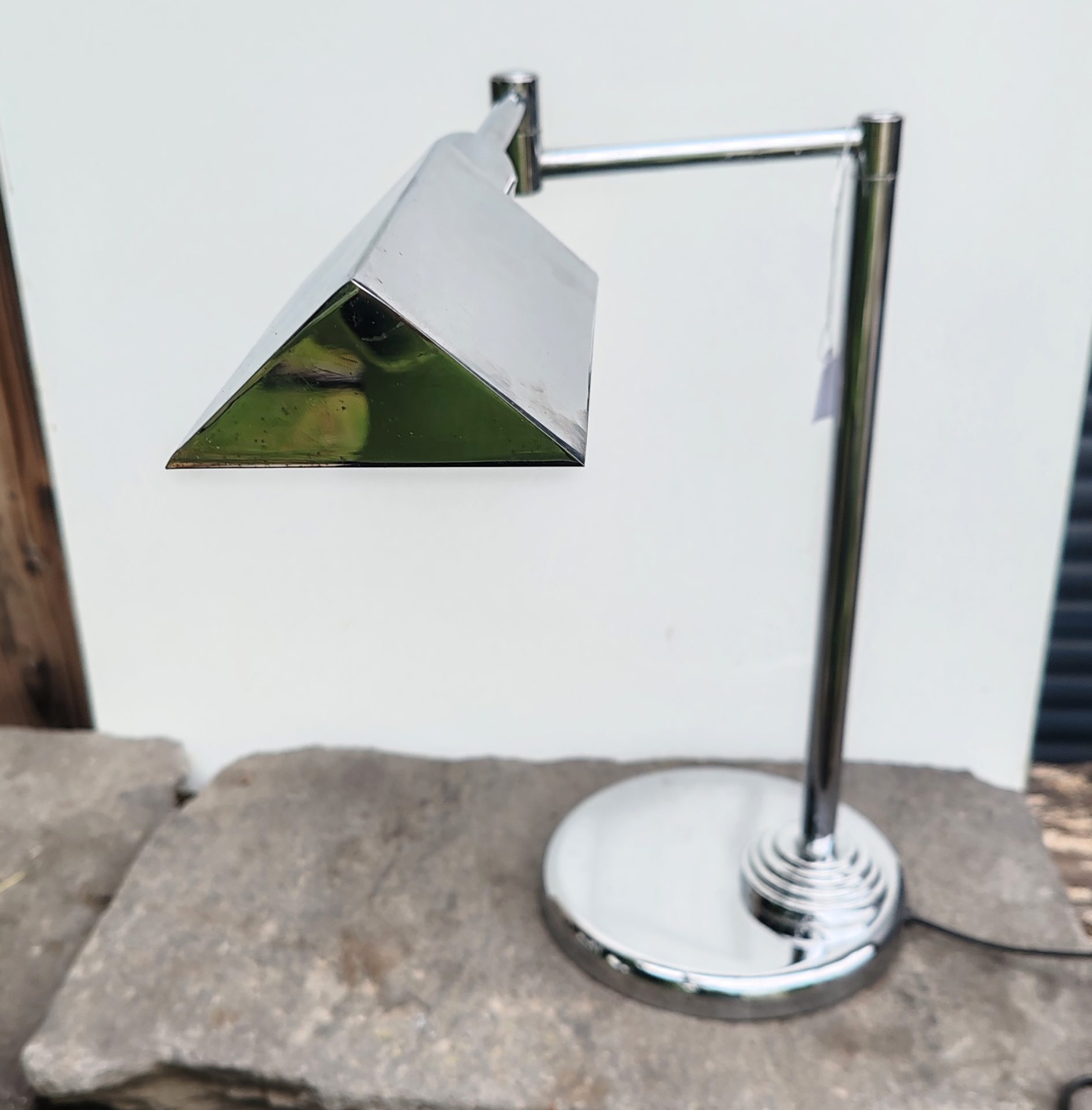 Une élégante lampe de bureau en chrome poli attribuée à Koch & Lowy ; l’abat-jour en forme de tente s’articule sur une rotule et se règle sur un bras oscillant Période: 1970-1979