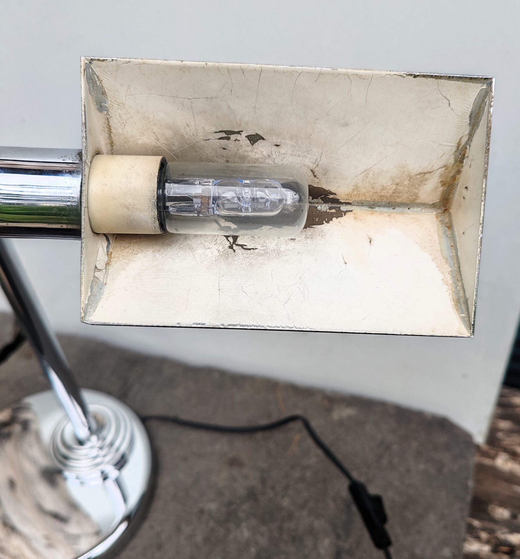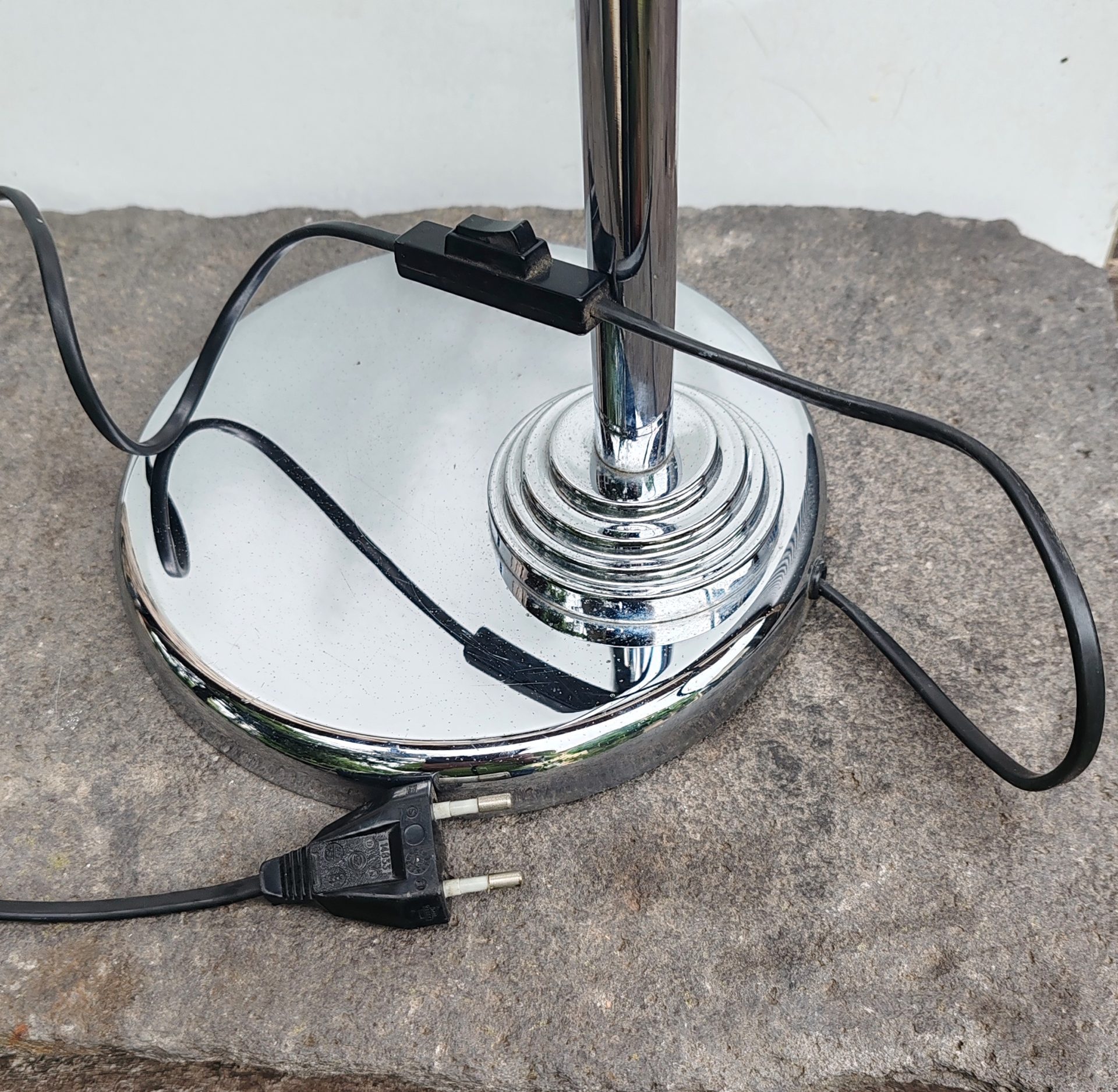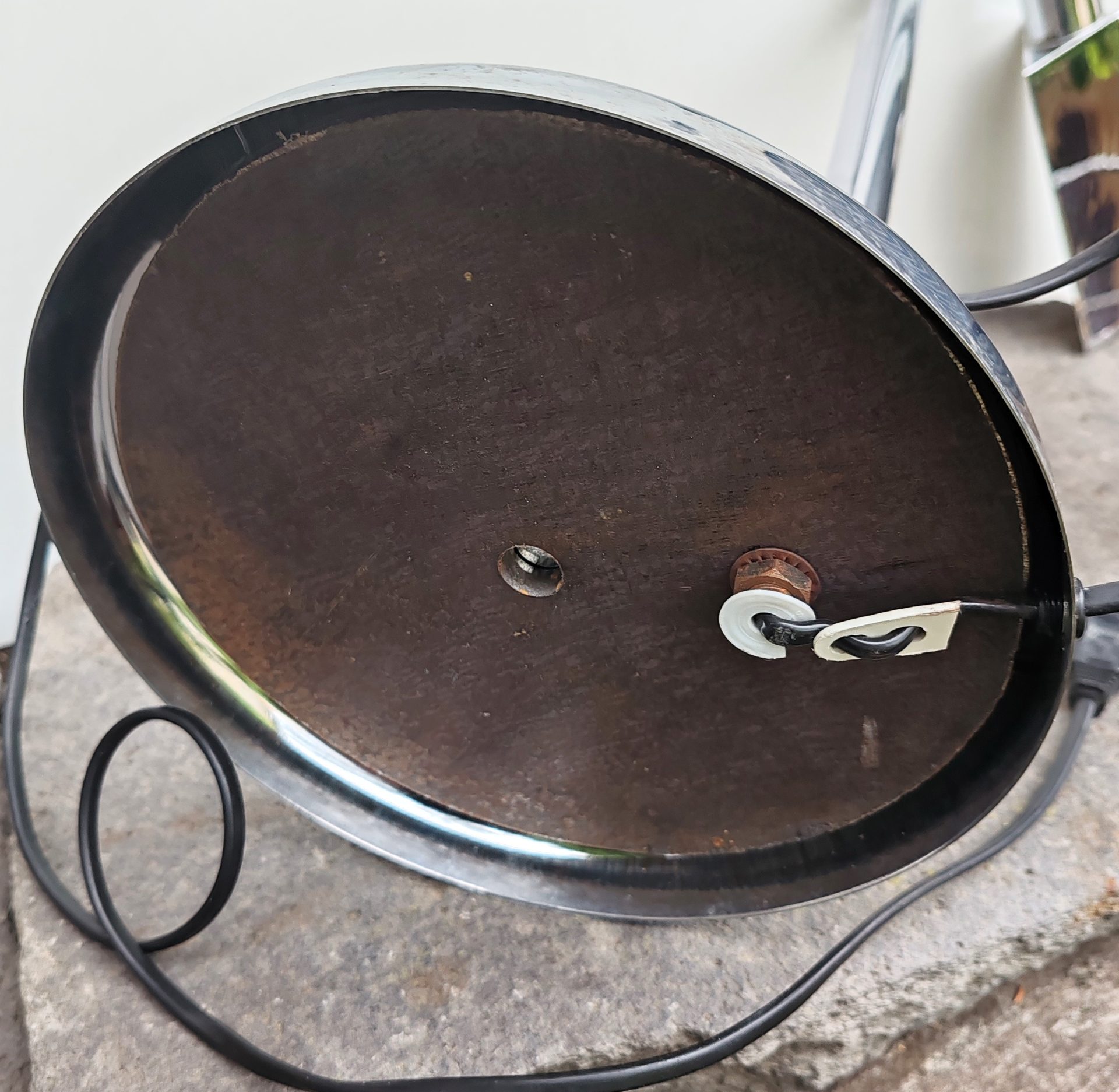 L’abat jour a des zones décolorées à l’intérieur. Le chrome est d’époque mais propre. Testé et fonctionnant.