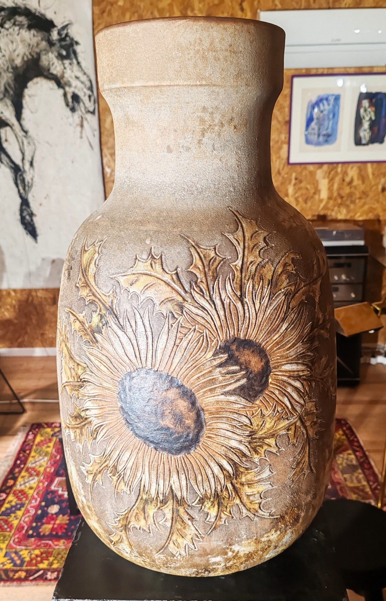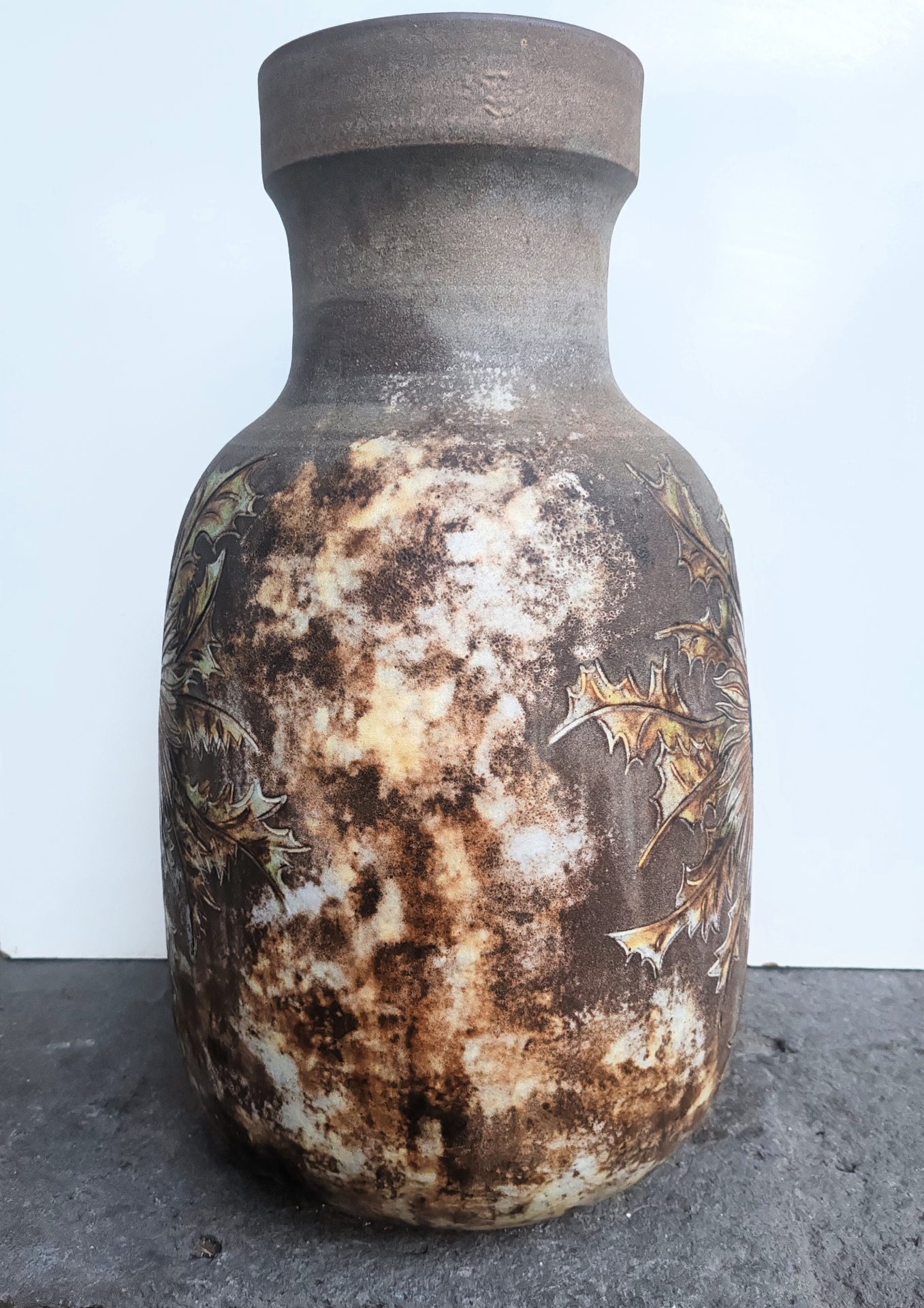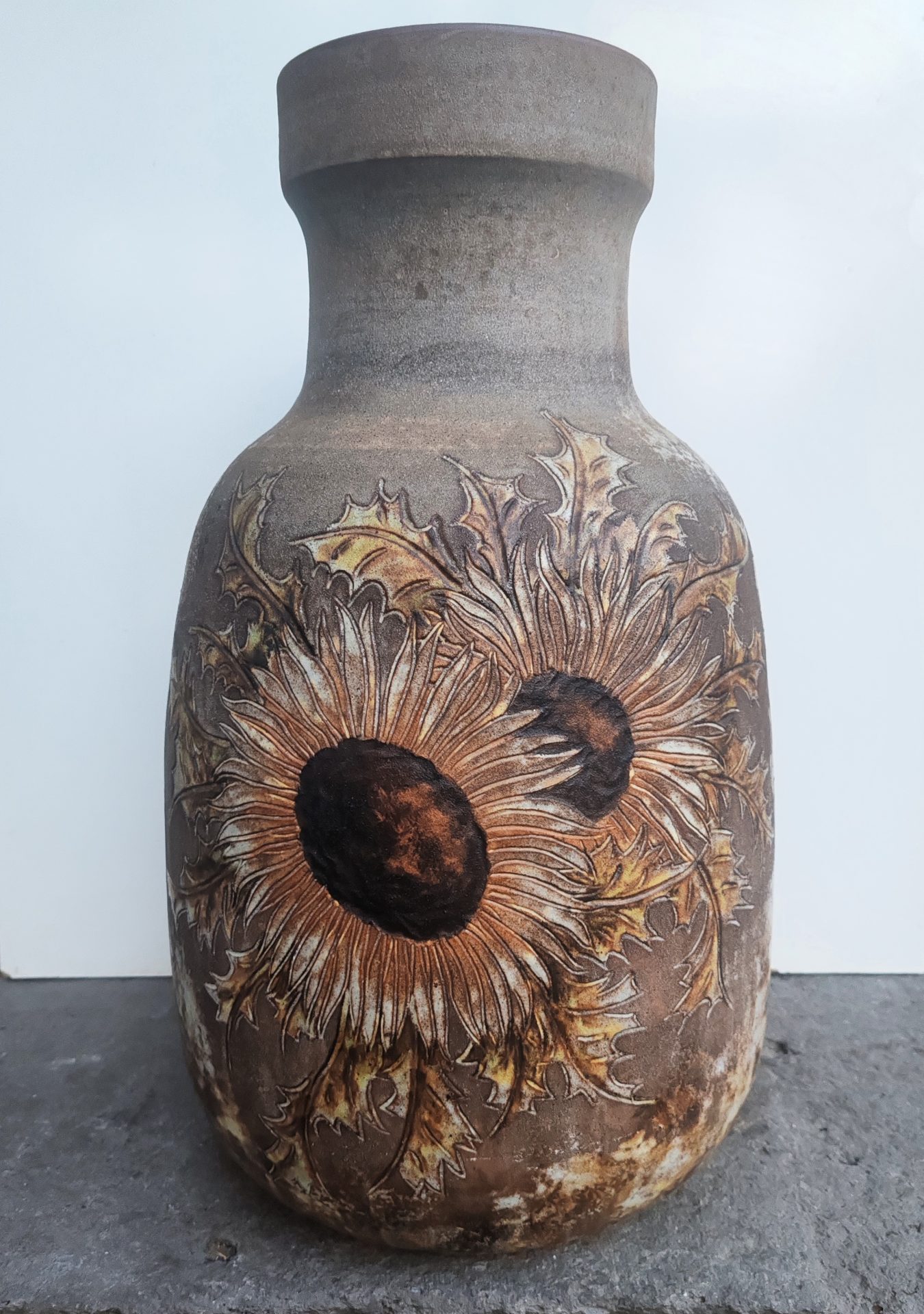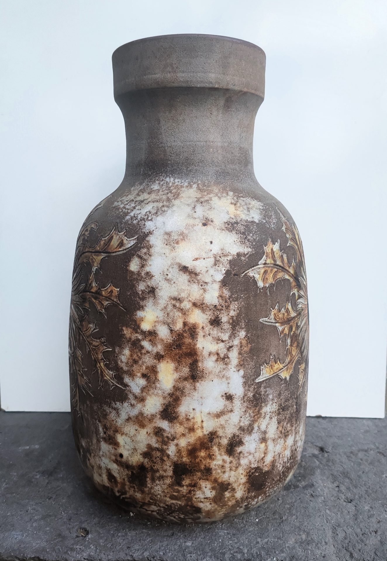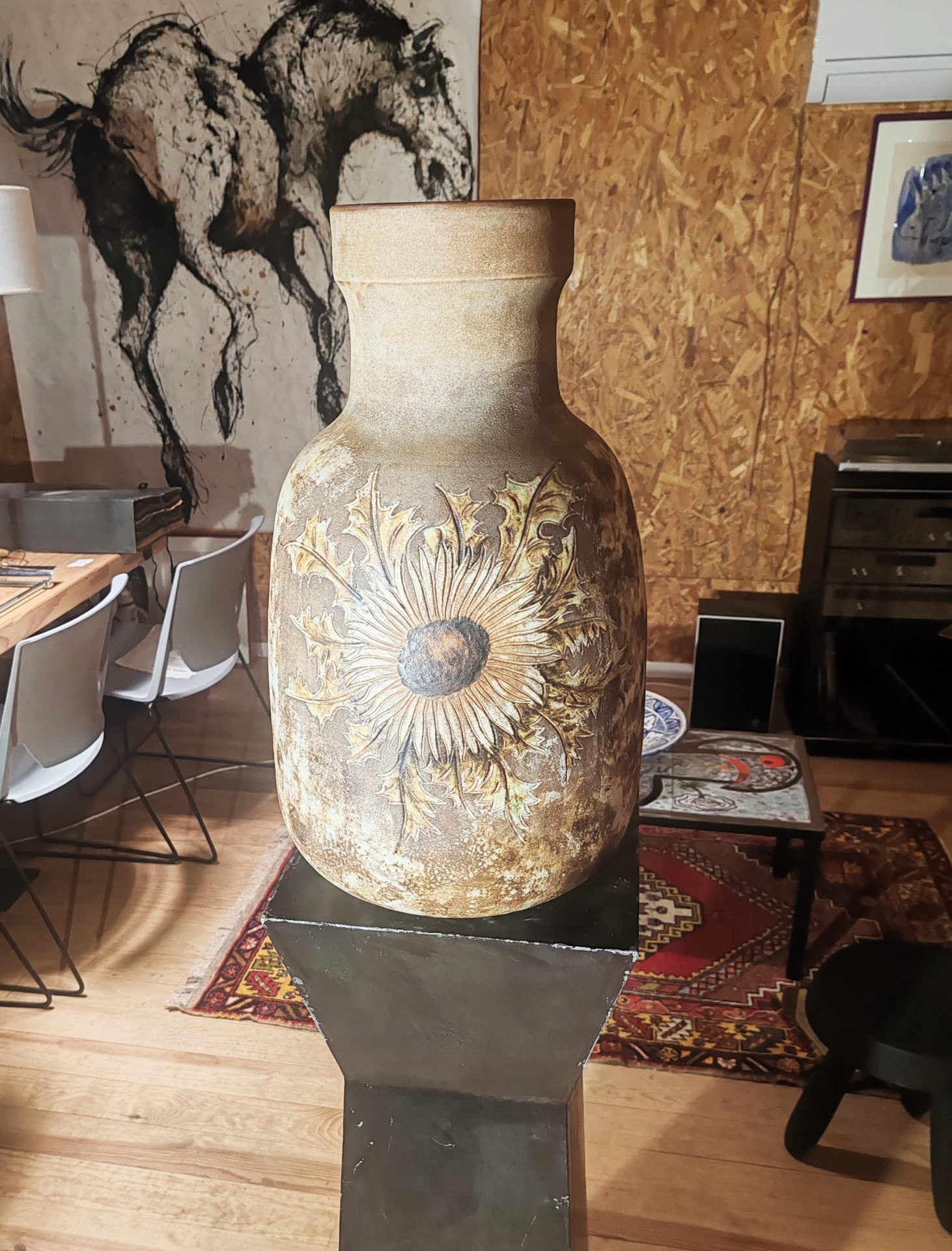 Son travail est épuré, d’apparence rustique mais d’une grande finesse, à motifs floraux ou abstraits dans des coloris proches des teintes naturelles de l’argile. Ce vase en est un joli exemple, avec un bouquet il sera encore plus beau!
