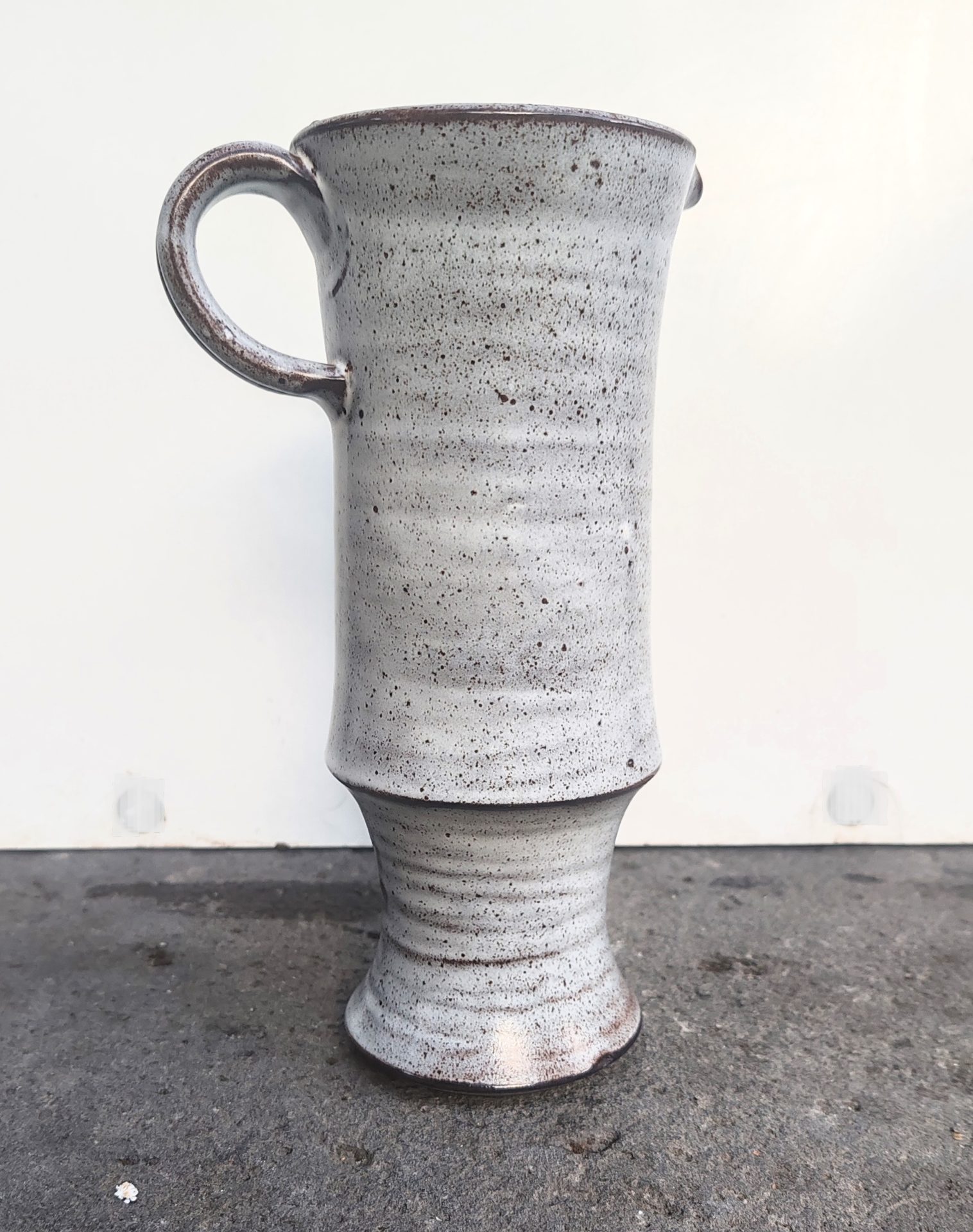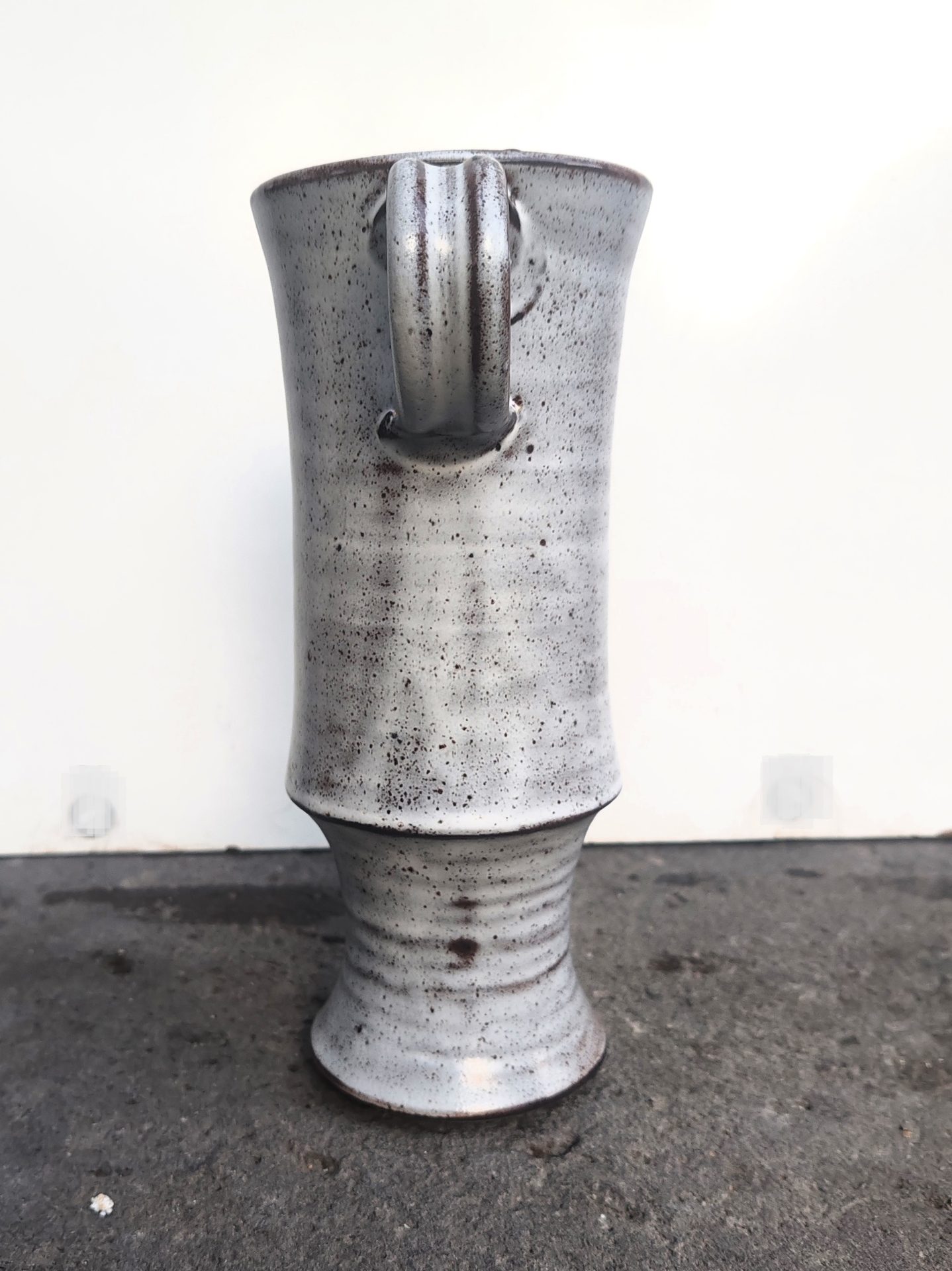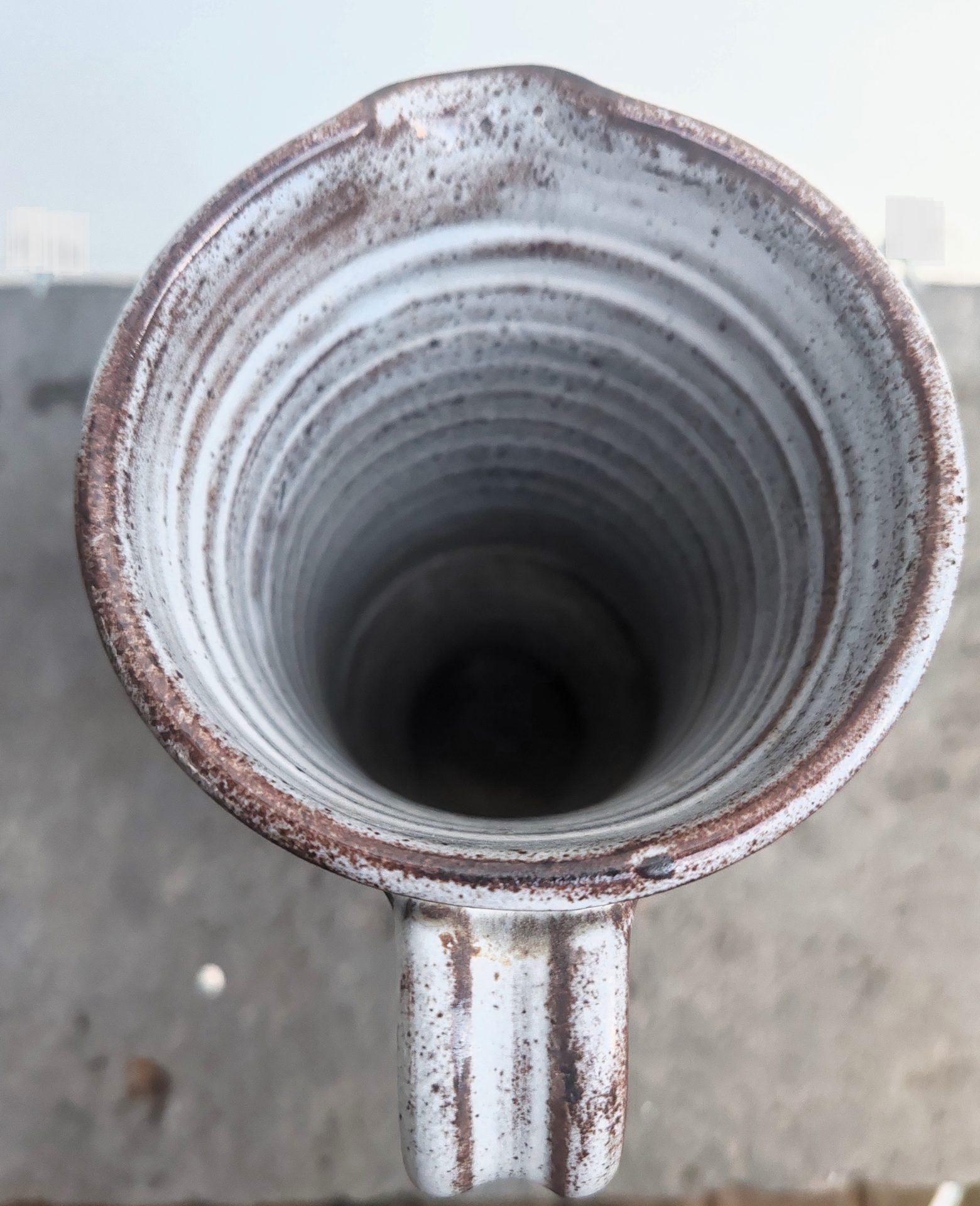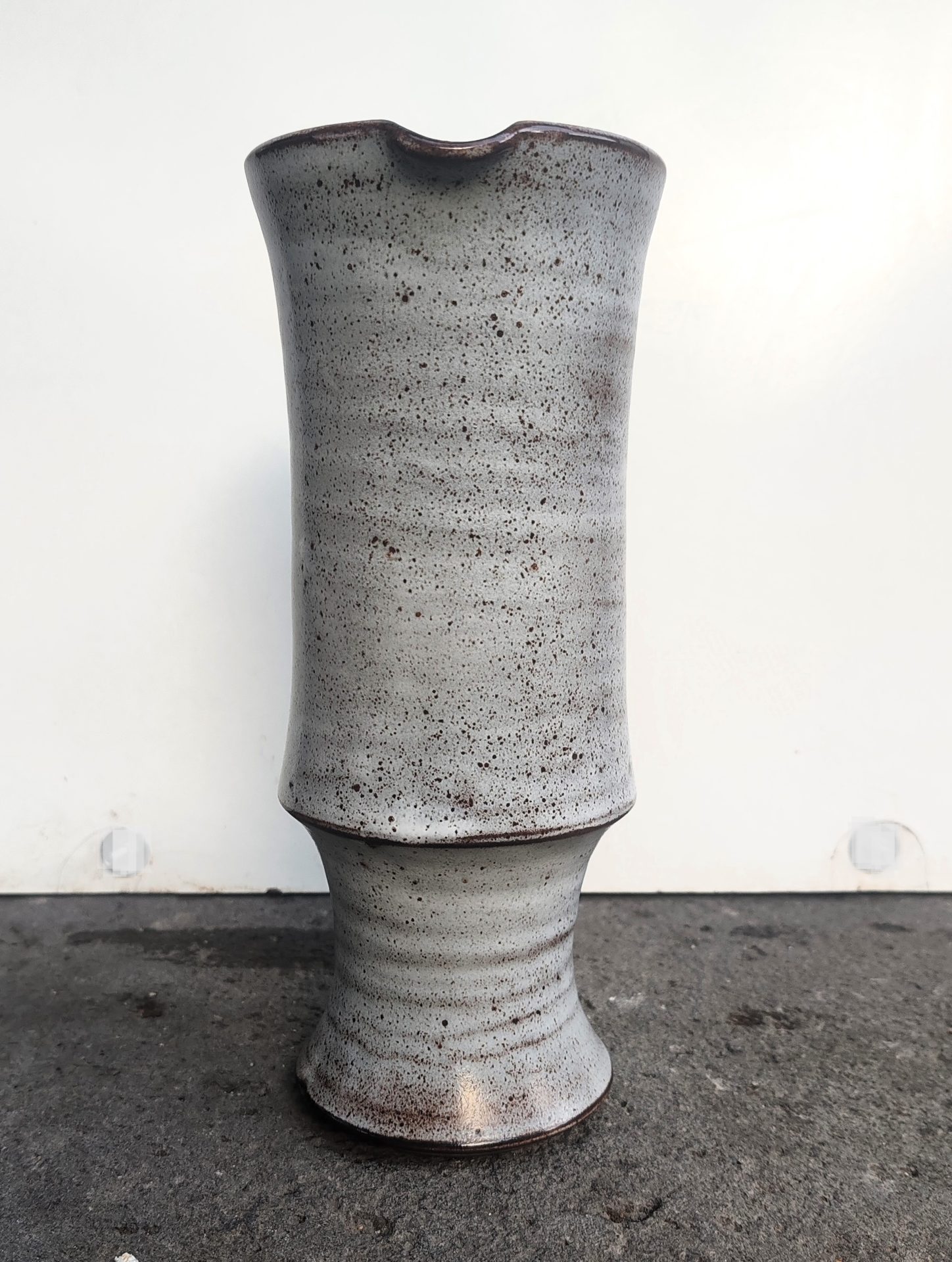 Elégant et grand vase/pichet en grès émaillé blanc sur fond brun, en deux parties de forme droite légèrement concave formant un anneau au tiers de sa hauteur, émaillé blanc moucheté de brun.
