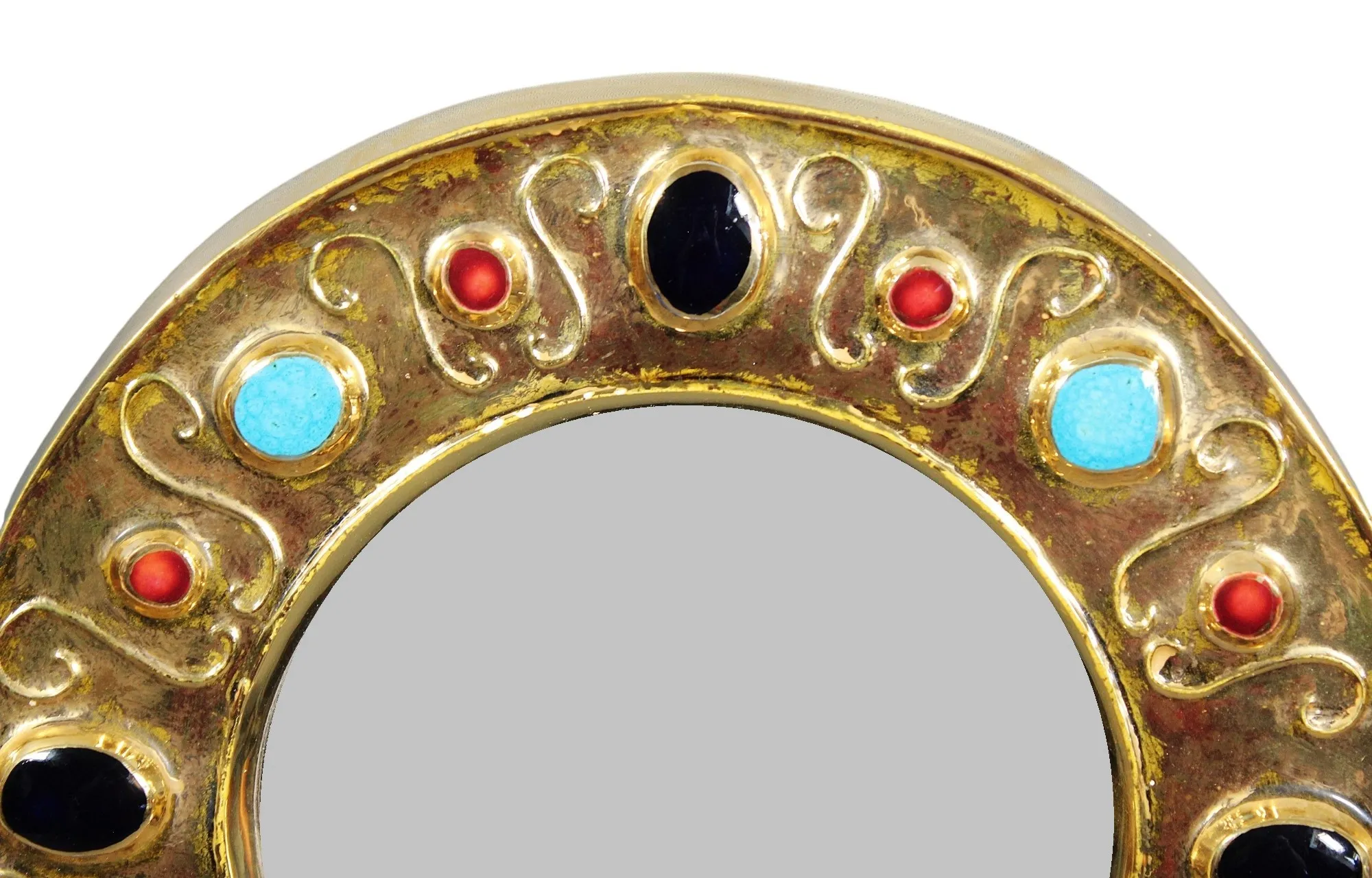 Francois LEMBO (1930 – 2013) : Miroir rond en céramique émaillé or, à décor de cabochons façon turquoise et noir « Vallauris »