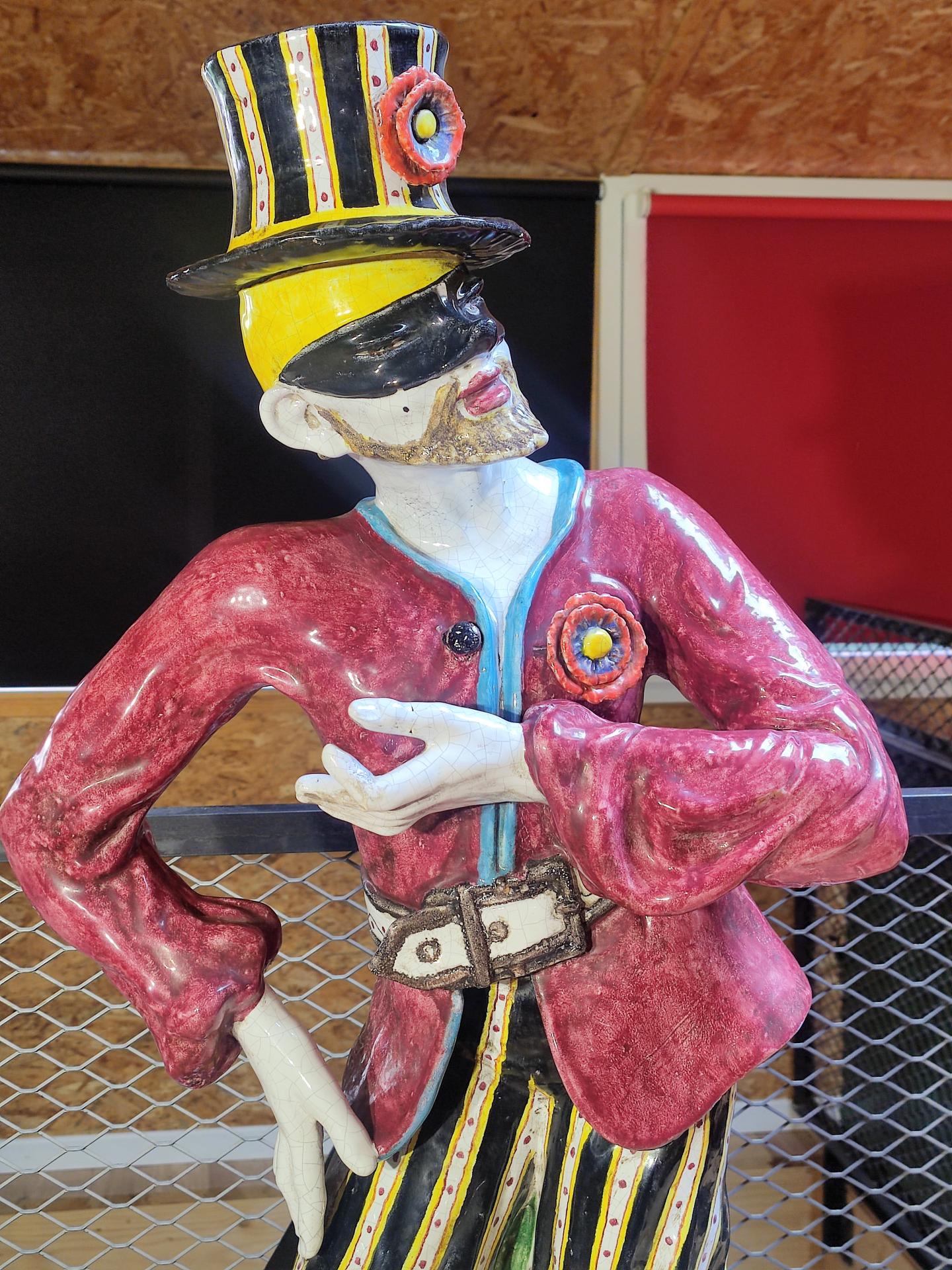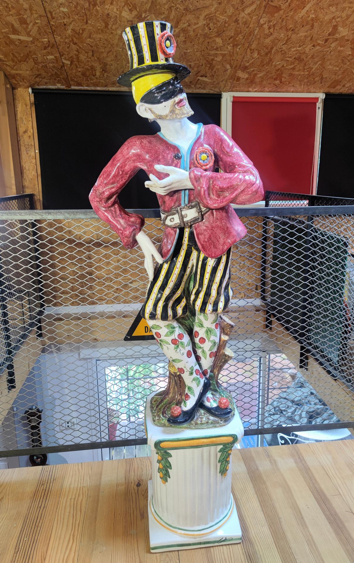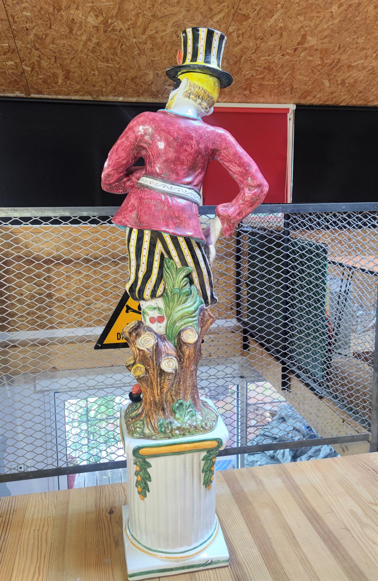 Importante paire de figurines d’arlequins DE LA COMMEDIA DELL’ARTE en  majolique italienne du début du XXe siècle, DE CECCARELLI sur socle, représentant un homme et une femme, chacun portant un haut-de-forme, un pantalon rayé et une chemise rouge.