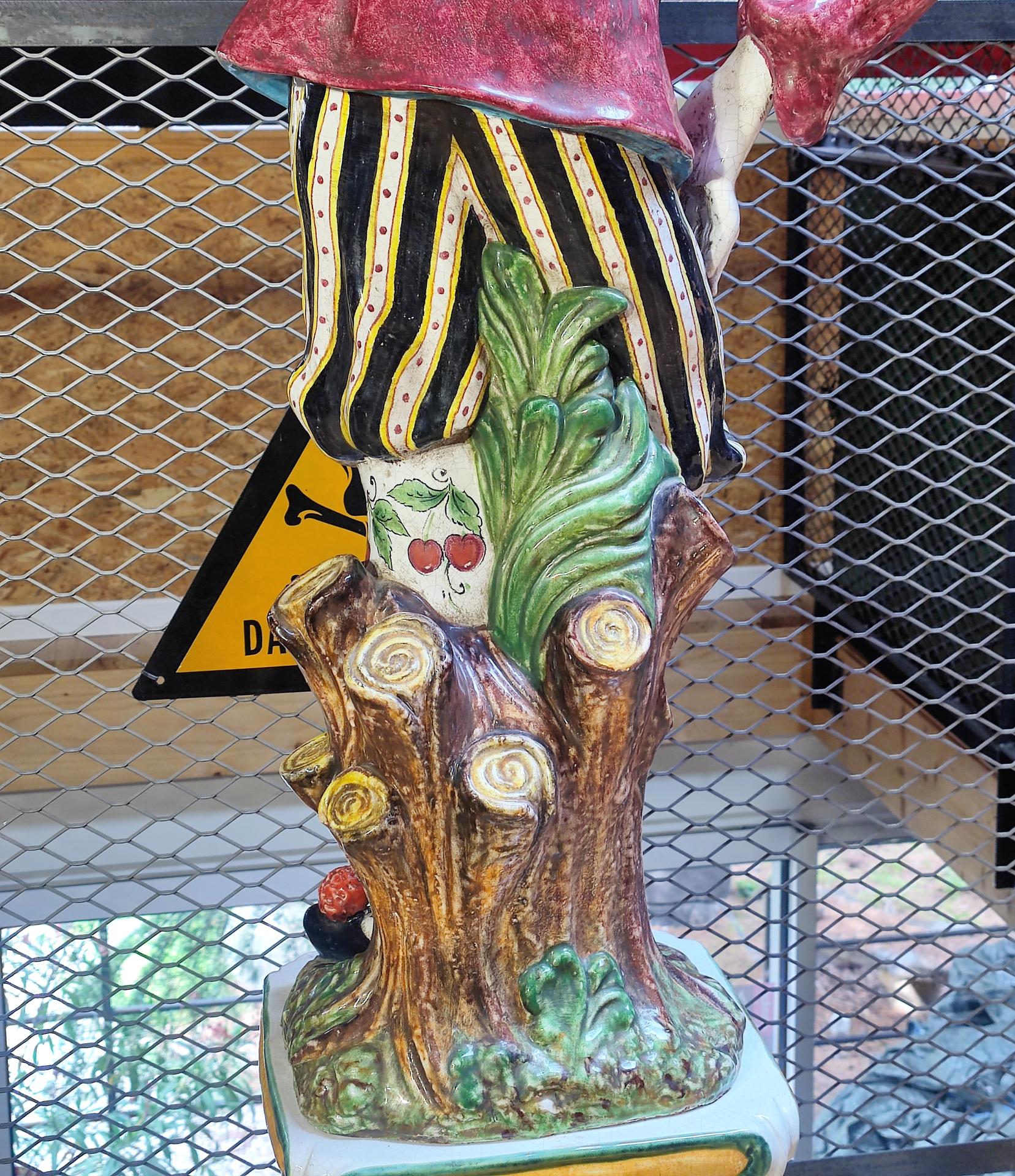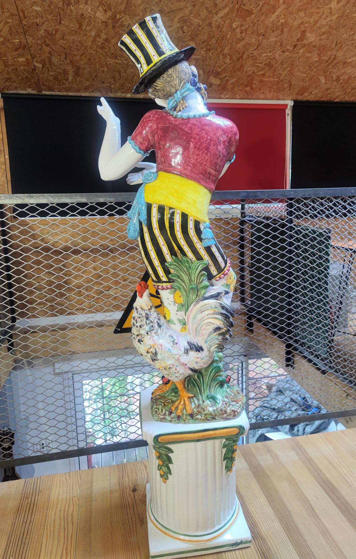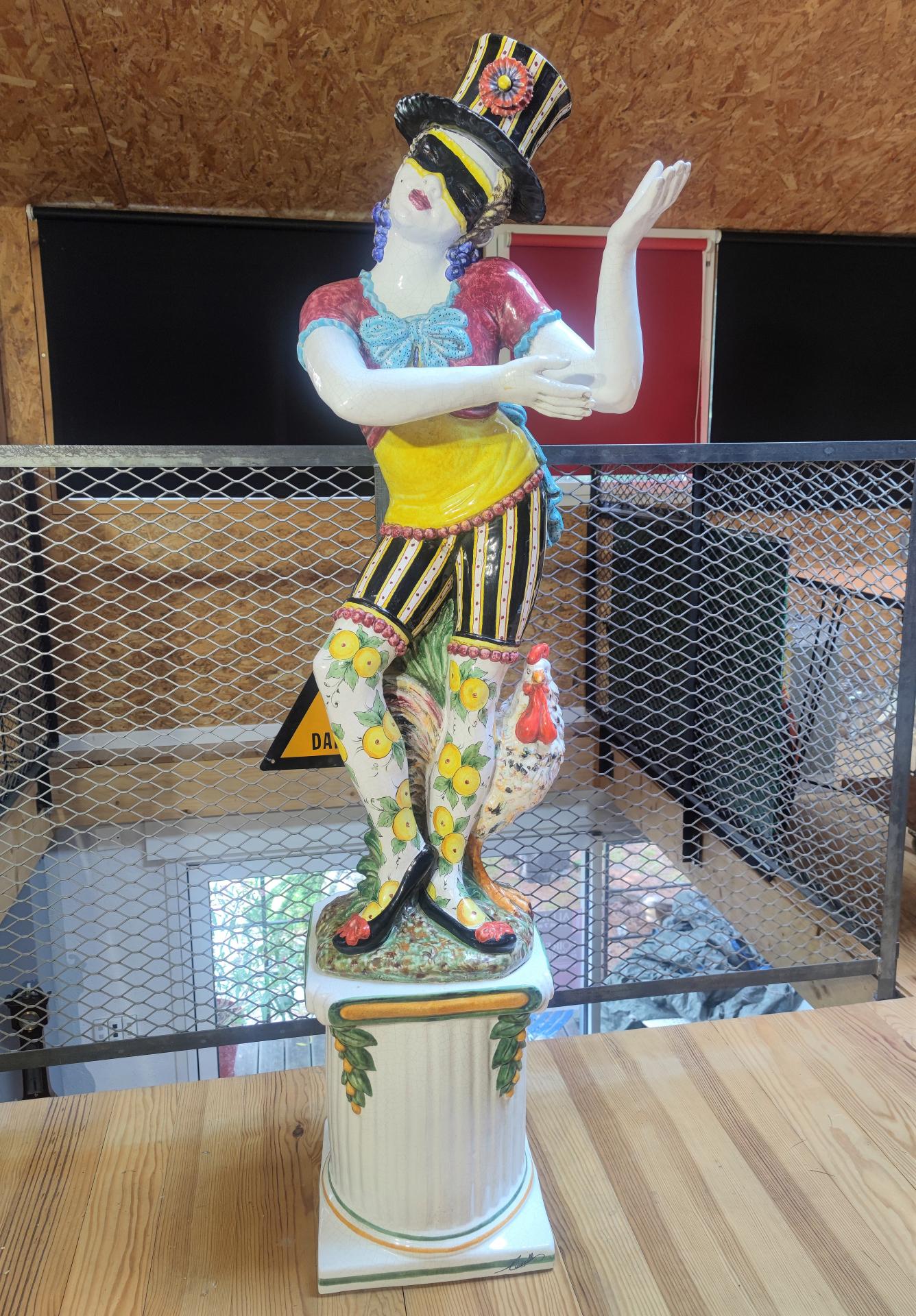 Importante paire de figurines d’arlequins DE LA COMMEDIA DELL’ARTE en  majolique italienne du début du XXe siècle, DE CECCARELLI sur socle, représentant un homme et une femme, chacun portant un haut-de-forme, un pantalon rayé et une chemise rouge.