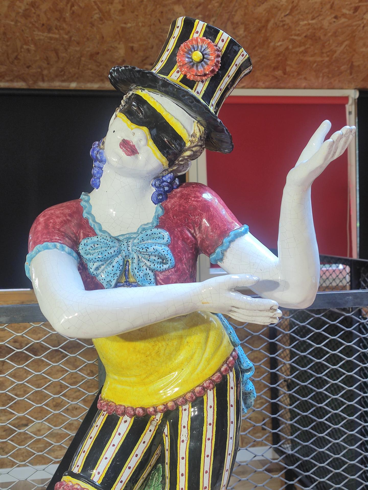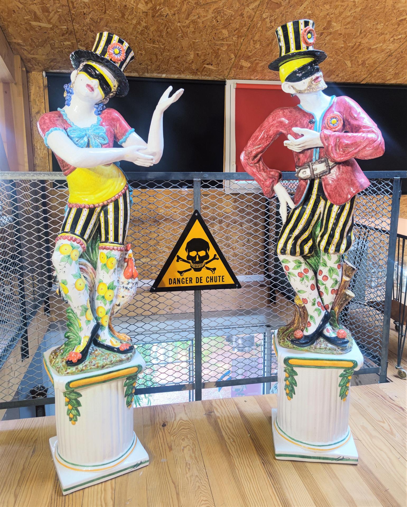 Faïence de style majolique, sur socles. Chaque figurine, composée de deux parties, représente un bouffon et une bouffonne, dans un style rappelant les sculptures de Maures.