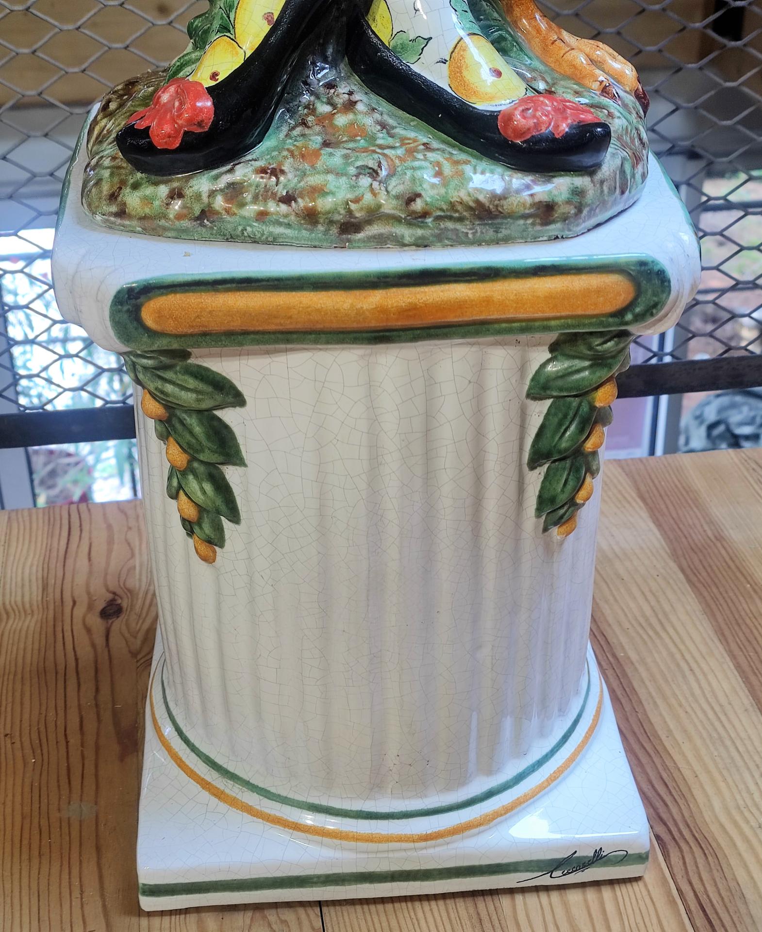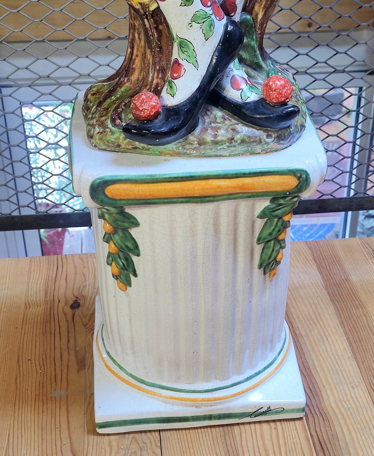Chaque figurine repose sur un socle cannelé amovible, orné de fruits suspendus verts et orange aux angles. Signées « Ceccarelli » à la base.