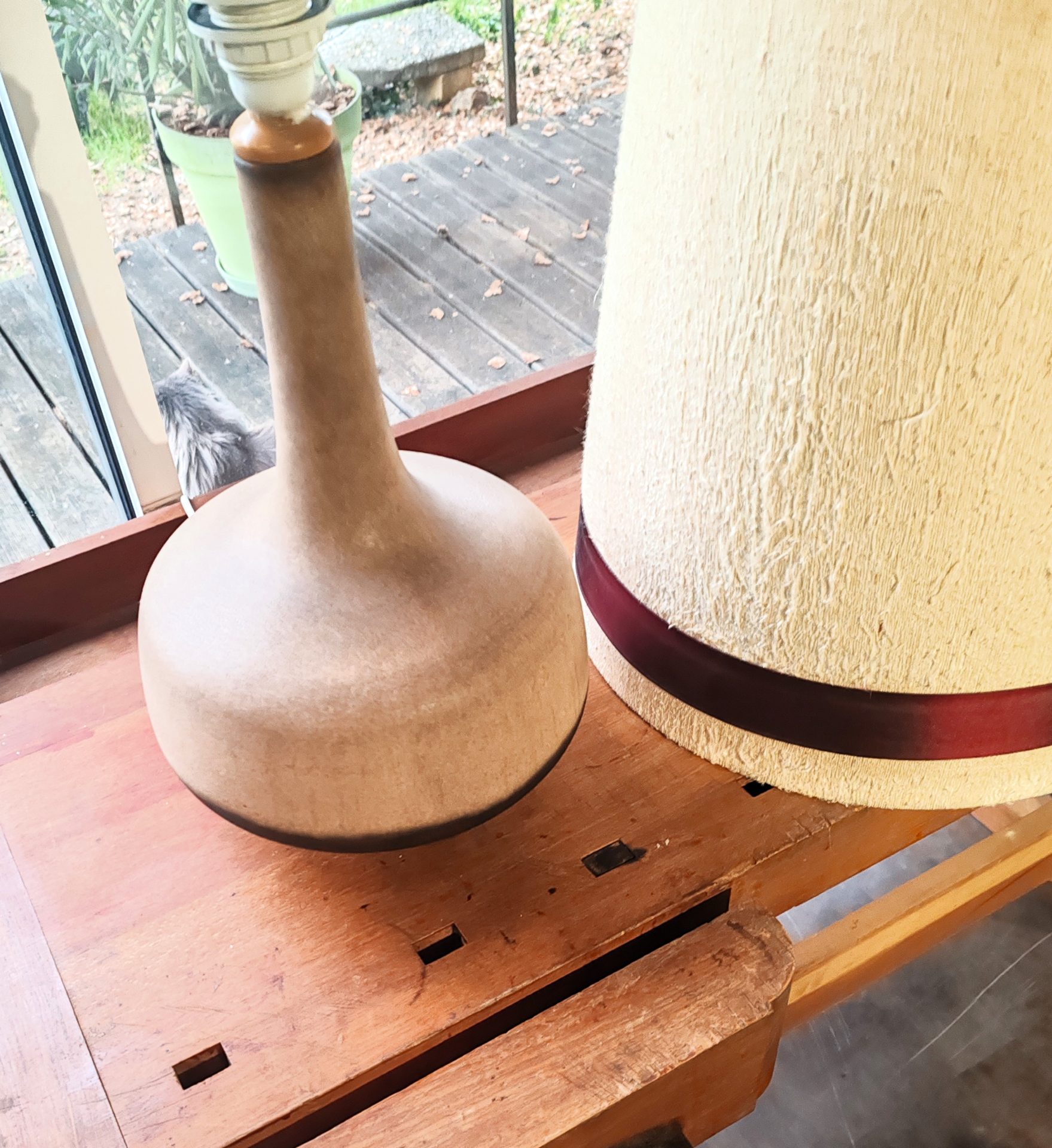 Paire de lampes vintage, lampes à poser, forme balustre arrondie, pied en céramique émaillée mate (ton beige / sable, finition légèrement granitée, base brune); abat-jour d’origine en tissu texturé, ruban galon couleur cerise, années  60/70, fabriquées par Karlsruhe Keramik Allemagne et conçu par Friedegart Glatzle