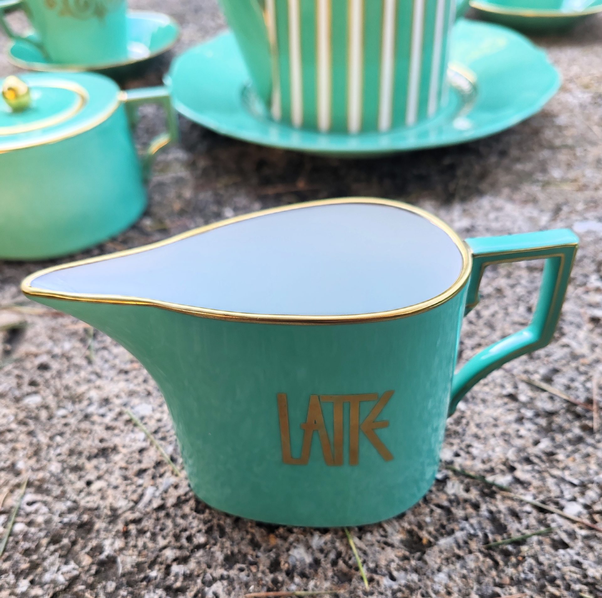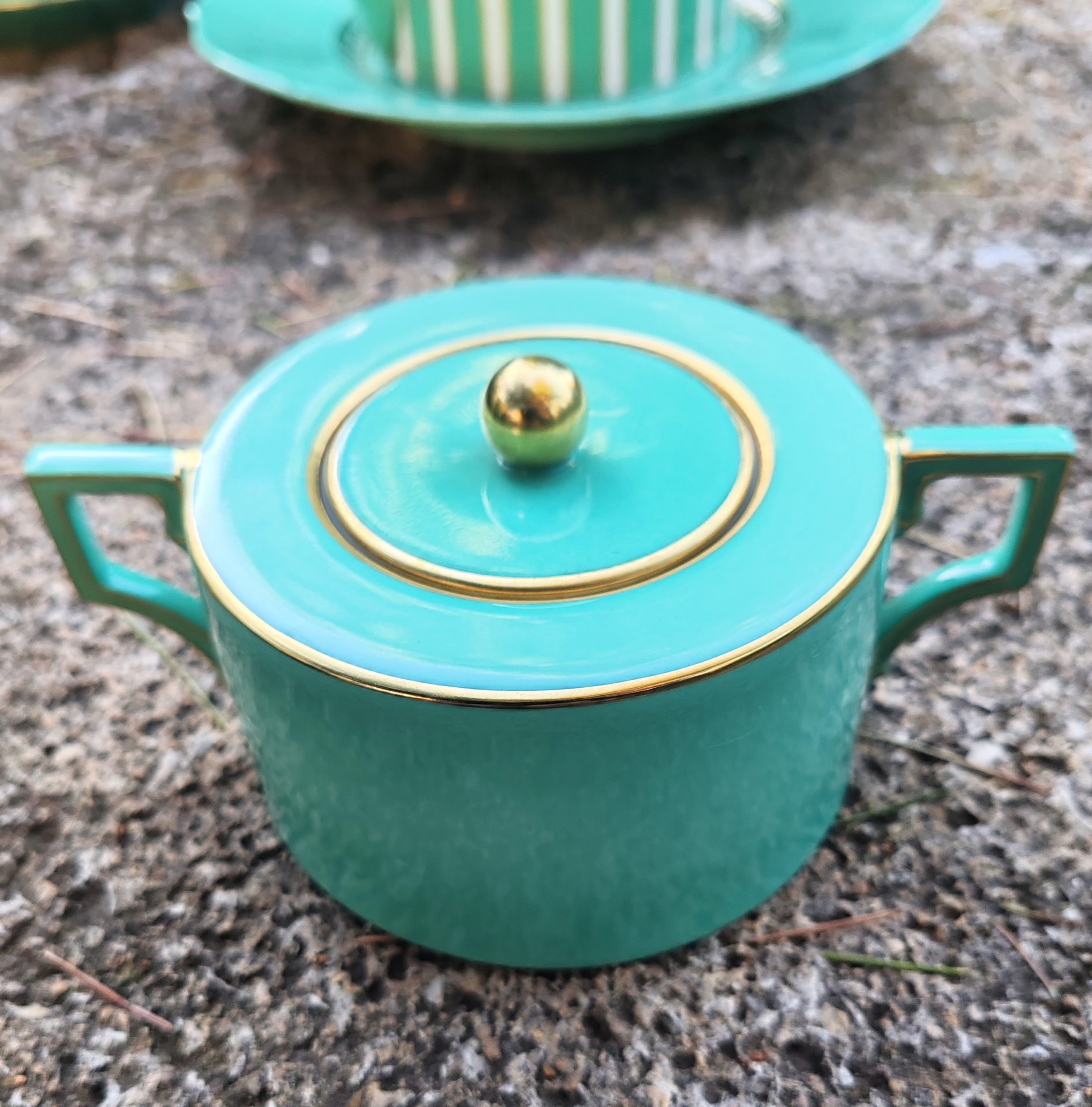 Comprenant : Theière ou cafetière et son assiette, 3 tasses et 3 sous tasses, 1 pot à lait, 1 sucrier, service décliné dans différentes variantes qui permettait de le composer suivant son choix