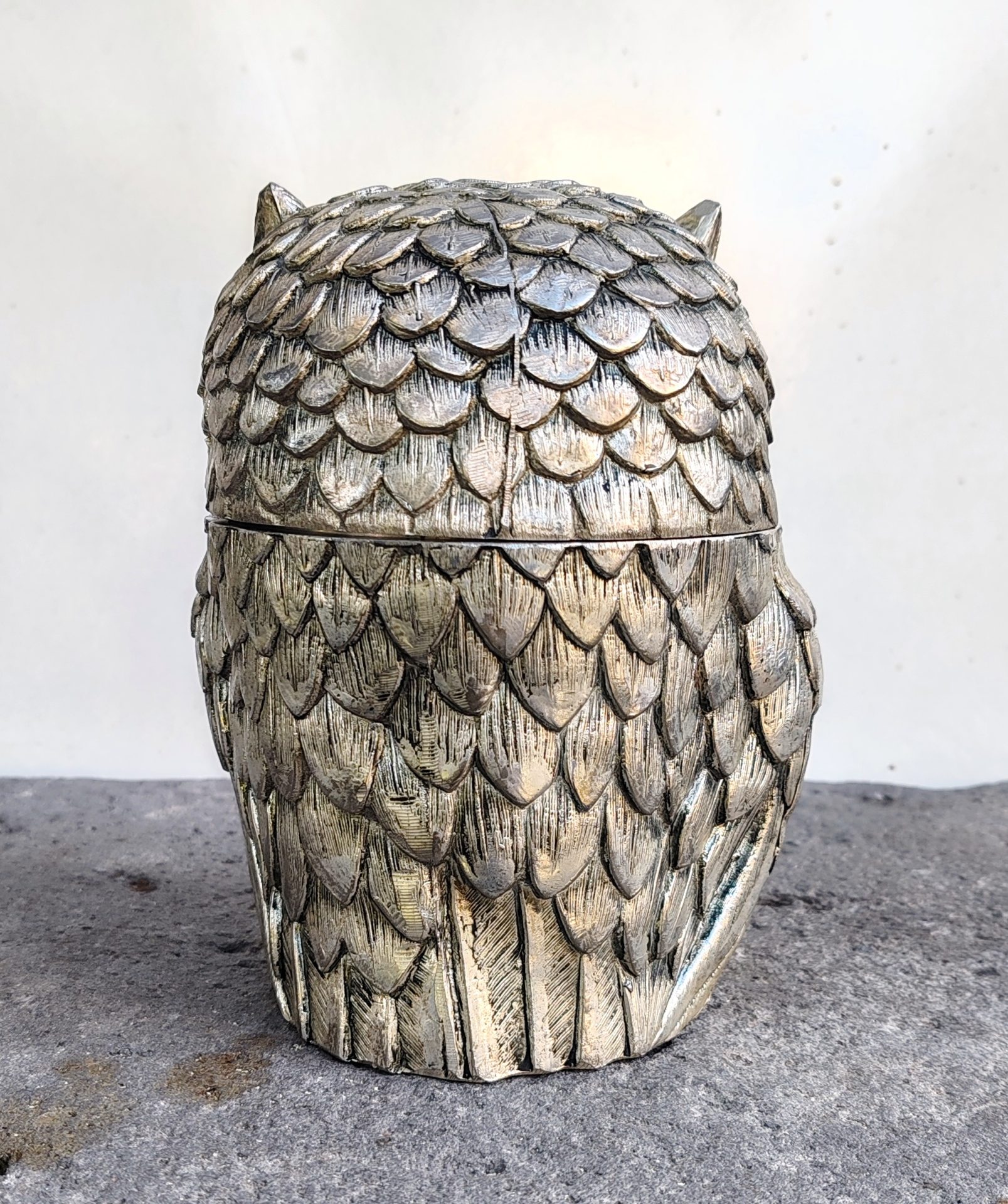 Mauro Manetti (né en 1946)  Seau à glaçon en forme de chouette ou de hibou Années 70, en fonte d’aluminium argentée à patine légèrement dorée, cette pièce allie fonctionnalité et design sculptural.
