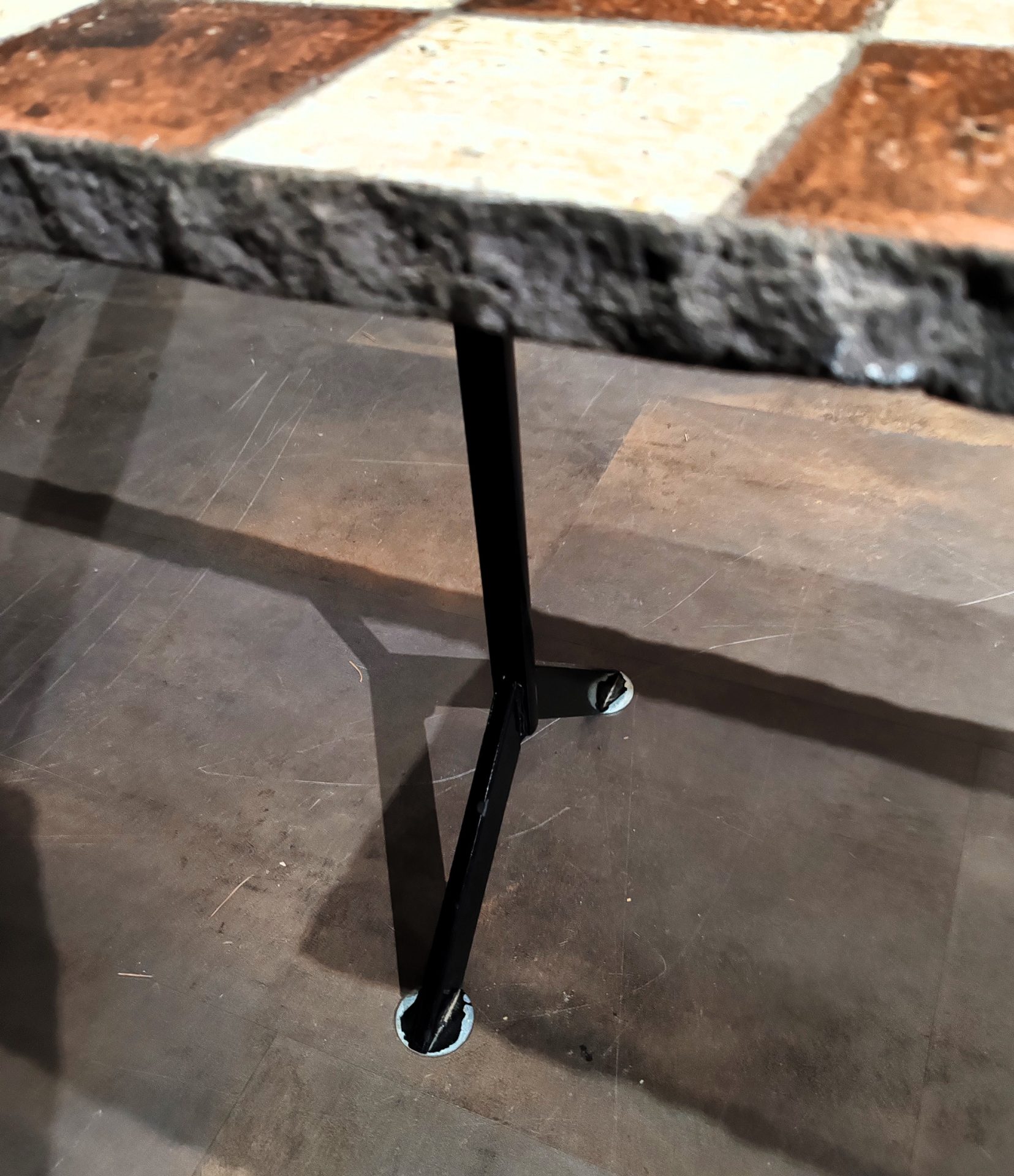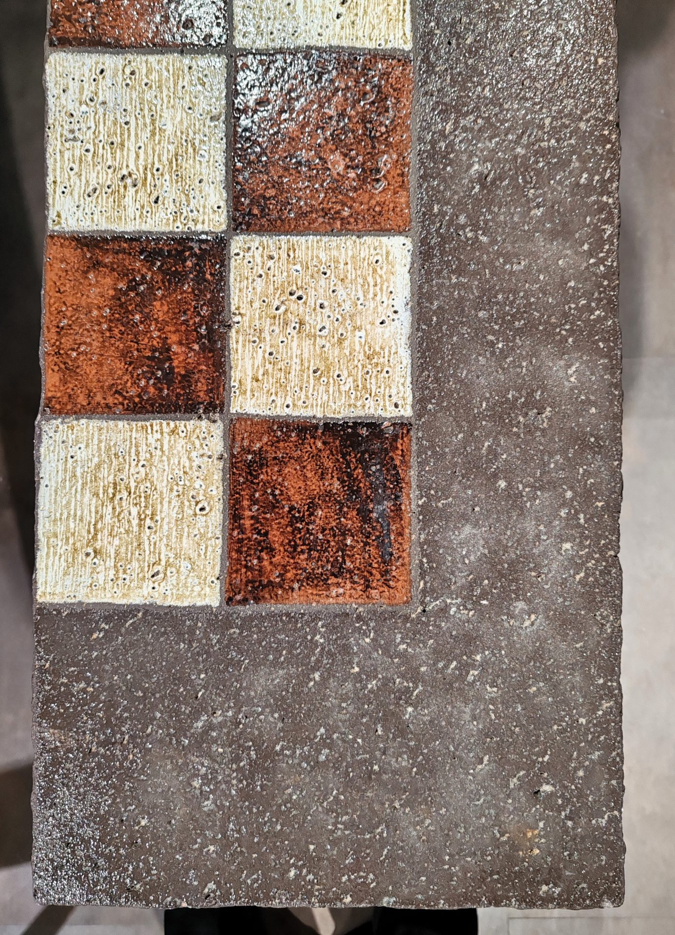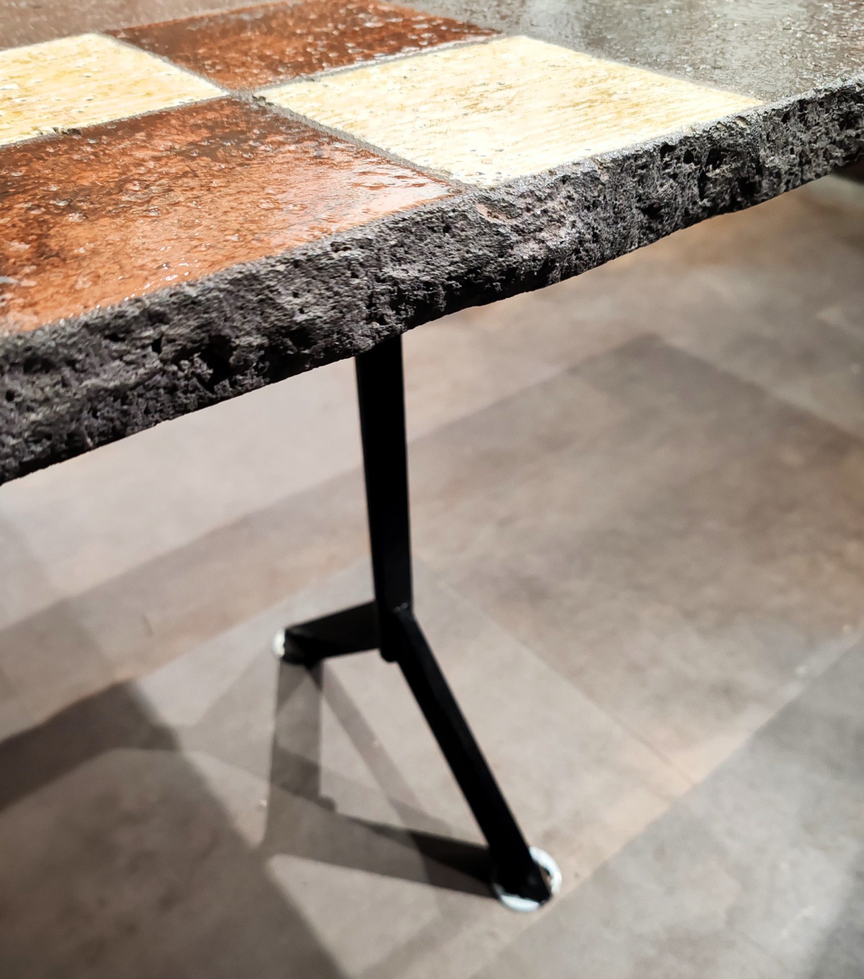 Etonnante table basse ou d’appoint de style« brutaliste » des années 60, plateau en pierre de lave émaillée, à décor géométrique  de damiers de couleur crème et rouille, des pieds en fer forgé en forme de Y inversé.