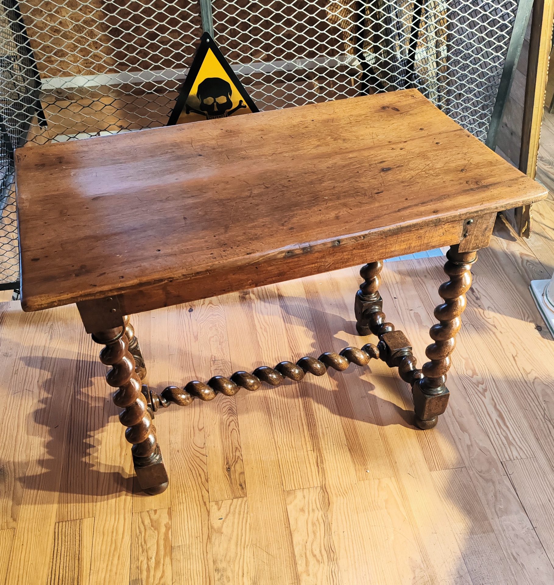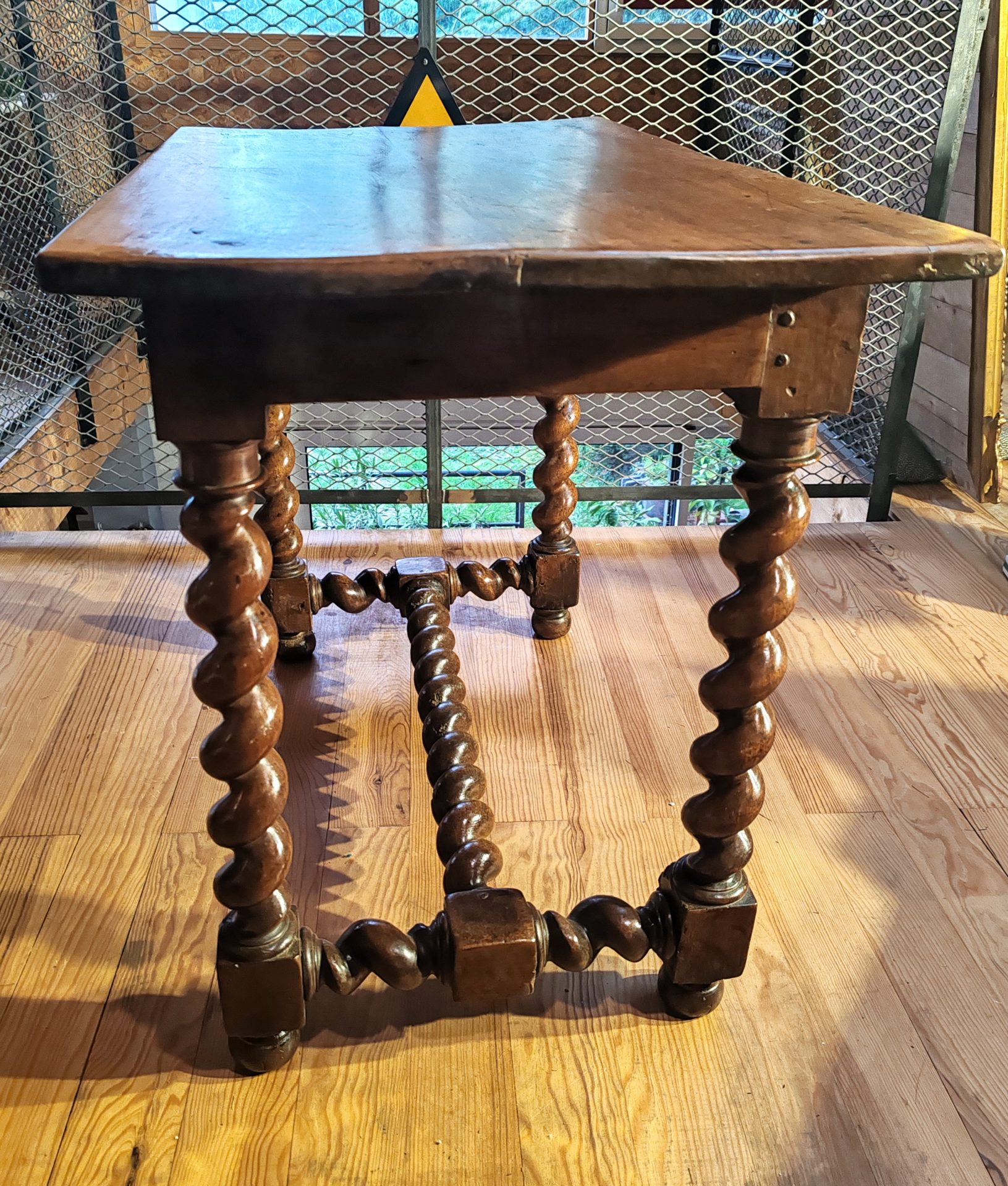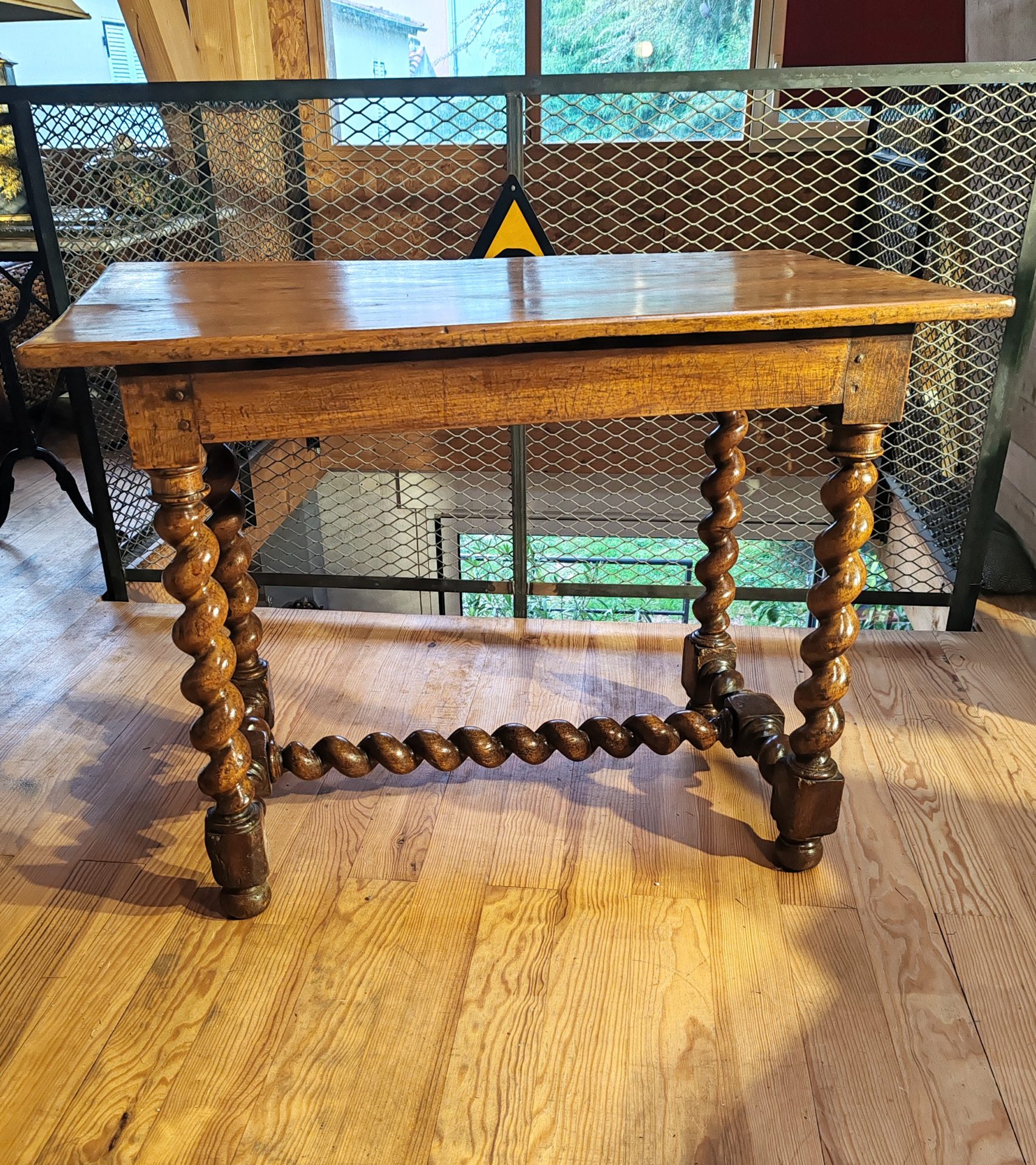 TABLE à écrire, table d’appoint, console, en noyer reposant sur quatre pieds à colonnes torses, réunis par une entretoise en H, à colonnes torses, style Louis XIII époque XVII eme siècle