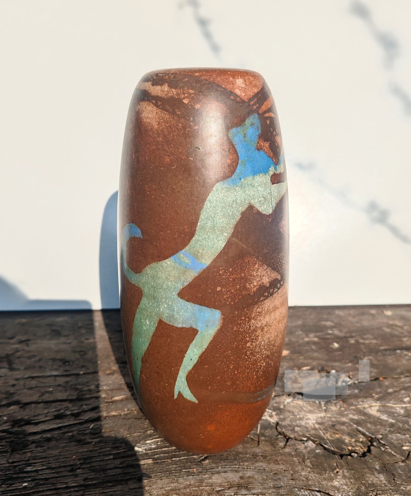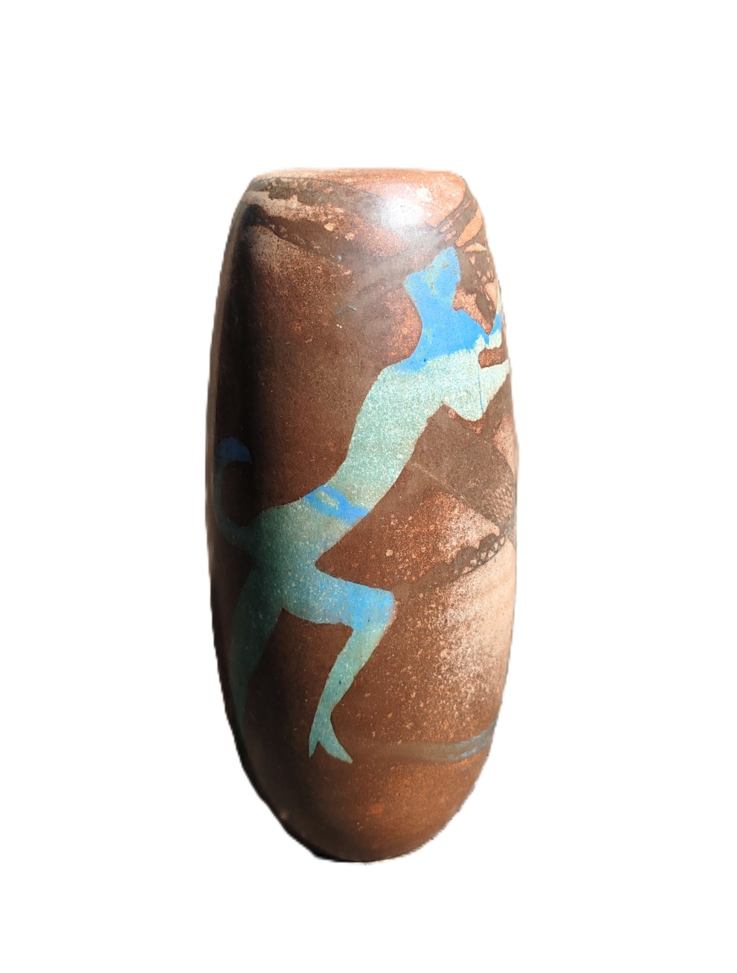 En tournant la pièce comme tourne la bobine d’un film, l’histoire dessinée se met en mouvement comme au cinéma. Le décor se dévoile avec grâce et légèreté ce qui témoignent du talent de l’artiste tant par la maitrise du geste du potier que par la créativité du peintre.