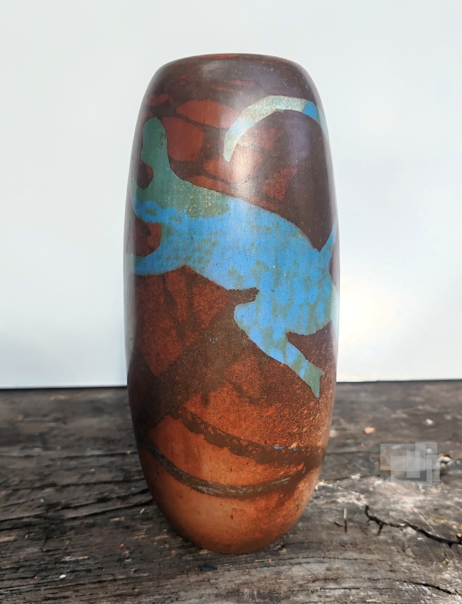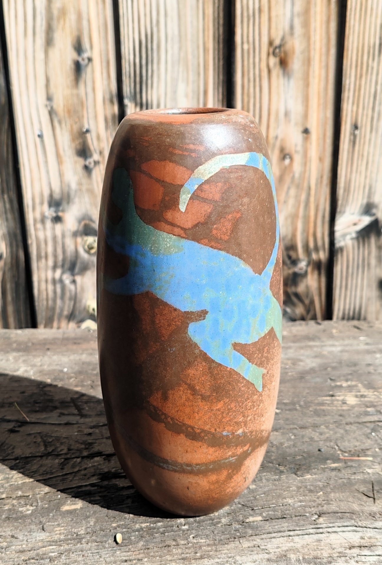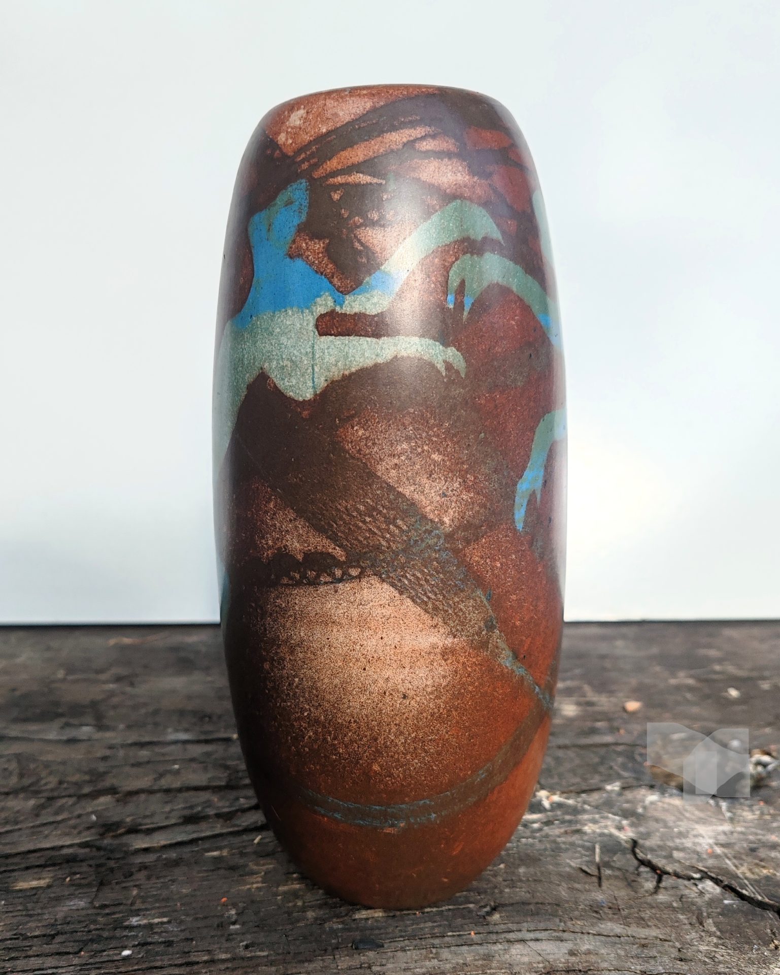 Depuis 1990, elle s’exprime aussi à travers la peinture en habillant ses vases ovoïdes. L’originalité de sa démarche artistique est d’exploiter toute la surface pour imposer avec force et vie le décor pictural.